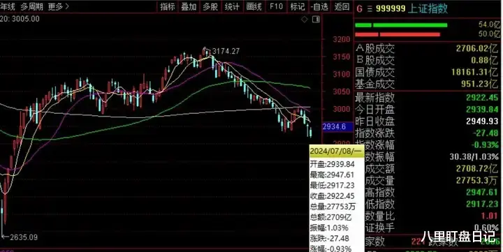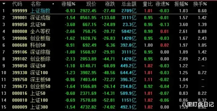 今天,上证指数跌0.93%,深证成指跌1.54%,创业板指跌1.6%,两市下跌4850家。成交额5820亿,目前成交量已经连续4个交易日低于6000亿。