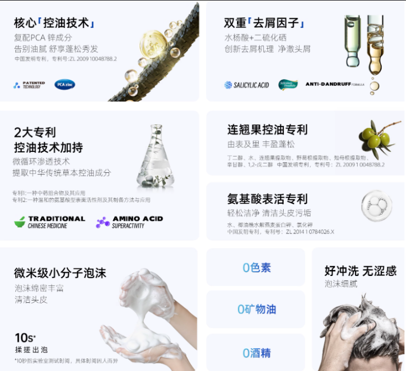 控油界顶流:复配 PCA 锌 + 连翘果专利提取物:PCA 锌像给皮脂腺装了 “智能开关”,从源头调节油脂分泌,让出油量刚好维持清爽;连翘果提取物是 ** 有专利认证(专利号:ZL 2009 1 0048788.2)** 的控油成分,能深层渗透头皮,疏通油脂堵塞的毛囊,还能让头发从发根开始变蓬松,油头秒变 “空气头”。