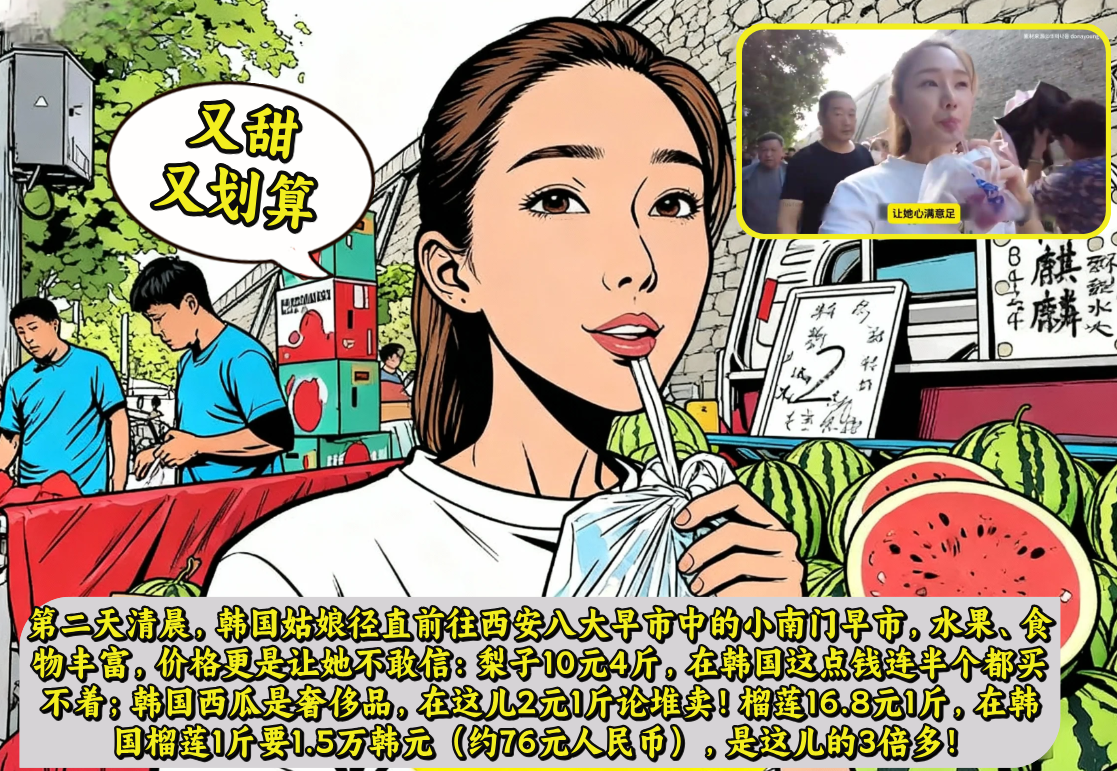 次日清晨,韩国姑娘径直前往西安八大早市中的小南门早市,她早闻中国早市小吃丰富且价格低廉,一踏入其中,只见早上六点多,早市上已有诸多人群,摊位满满当当,果蔬肉类新鲜至极,她好象来到一个满是美食的全新天地!再看水果价格,更是让她不敢信:梨子十块钱四斤,在韩国这点钱连半个都买不着;猕猴桃两块五一斤;韩国当奢侈品的西瓜,在这儿两块钱一斤论堆卖!韩国姑娘想拎个西瓜,可惜拿不动,只能作罢。