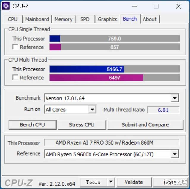 CPU-Z基准测试,AMD 锐龙AI 7 PRO 350虽然是移动端CPU,但这个表现却不逊于一些桌面端的CPU。