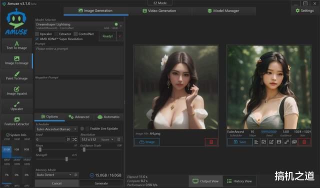 除了文生文,Dell Pro 14 Plus搞定文生图也不在话下,对于AMD平台来说,AMUSE是一个比较好用的工具,该软件是一个免费的本地化AI工具,不仅能够实现文生图、图生图,还能进行绘画生图、视频生成等二次创作,该软件可在AMD官网下载。