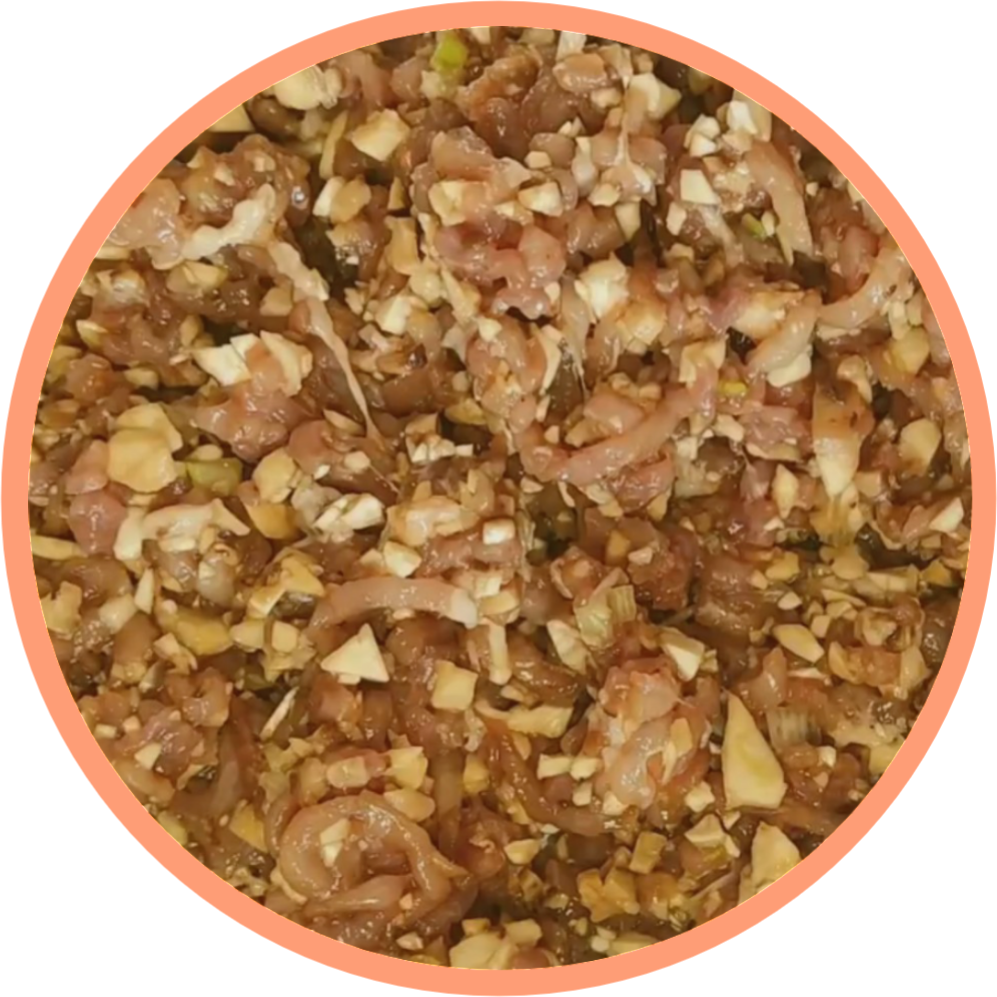鸡肉剁碎加姜末、盐、生抽、蚝油、白胡椒粉拌匀,包菜洗净后切成碎末,挤干水分,然后把包菜末和鸡肉馅拌匀,最后加点香油,轻轻拌匀即可。