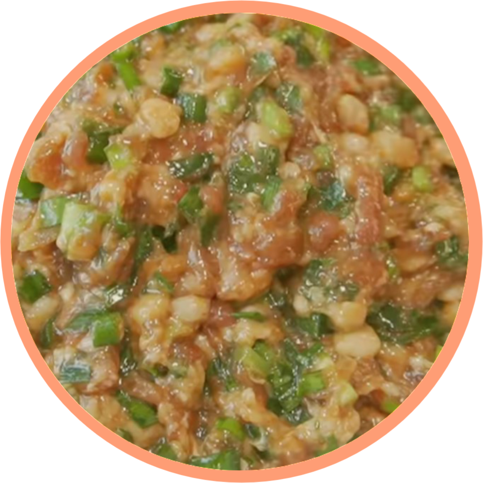 羊肉剁碎加盐、生抽、香油、白胡椒粉搅匀,分3次加入花椒水继续搅至粘稠上劲,再拌入切碎的大葱,拌匀即可。