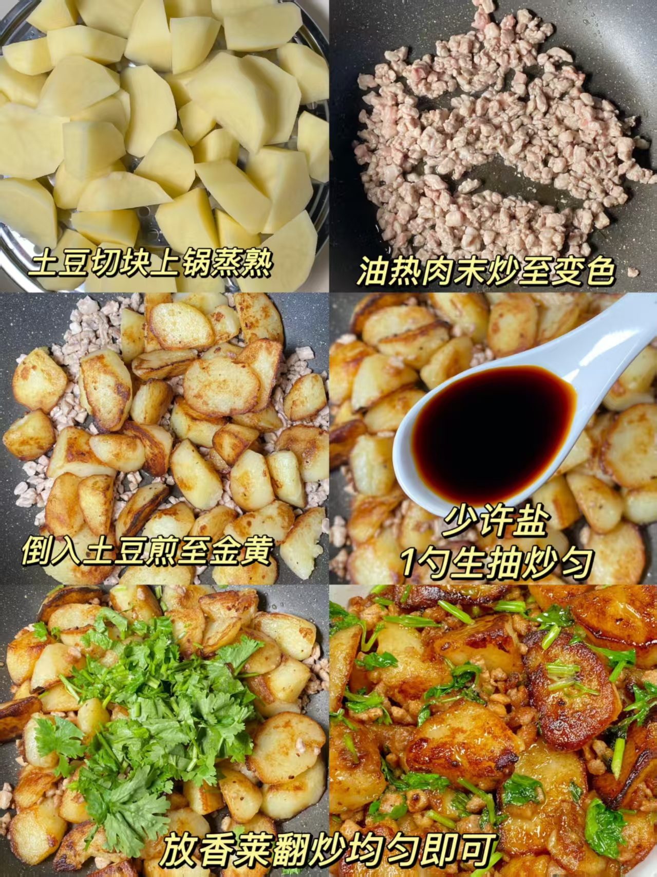 混合调味:将炒好的肉末倒入土豆泥中,加入适量盐,搅拌均匀;锅中留少许底油,放入葱花爆香,然后倒入土豆泥,快速翻炒几下,最后加入切碎的香菜,翻炒均匀即可关火。