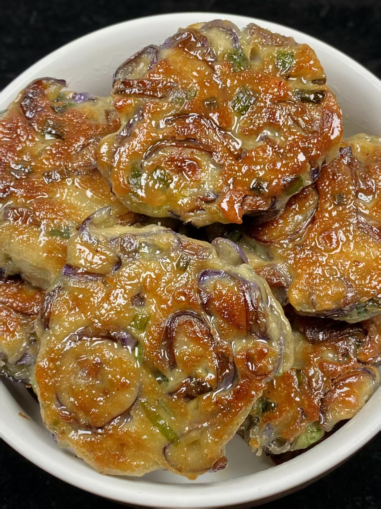 出锅装盘:煎好的茄子饼捞出,沥掉多余油脂,撒上葱花点缀(葱花既能增香,又能让颜色更好看),即可上桌食用。