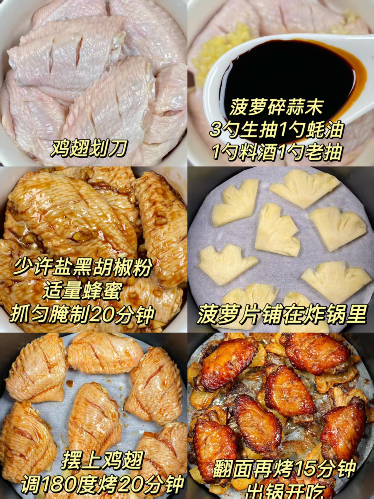 👉 小贴士:没有烤箱的话,用空气炸锅 180℃烤 20 分钟也可以;菠萝选熟透的,香甜味更浓,腌制出来的鸡翅更入味。