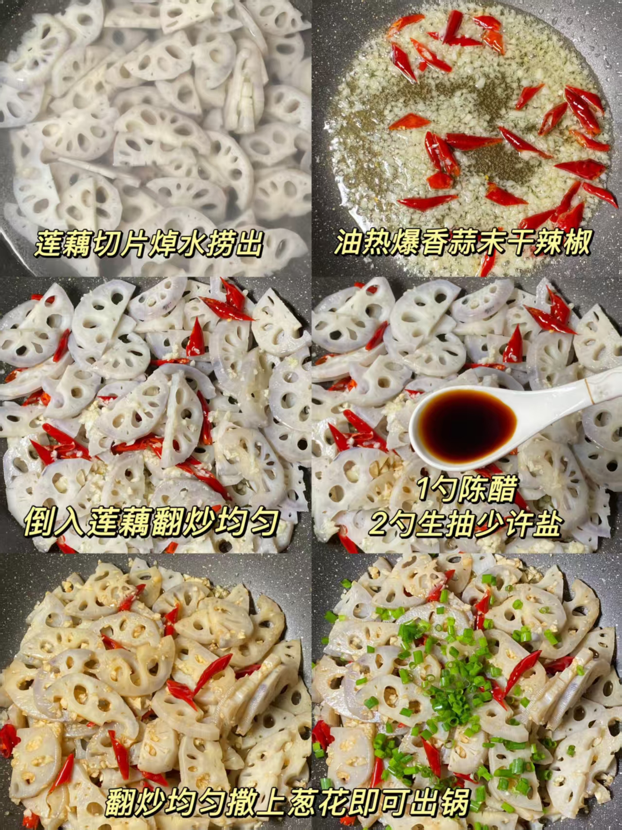 翻炒调味:倒入焯好水的藕片,大火快速翻炒 1 分钟;沿着锅边淋入陈醋(沿锅边淋醋,激出来的酸味最正),加入 1 勺生抽、适量盐,翻炒均匀。