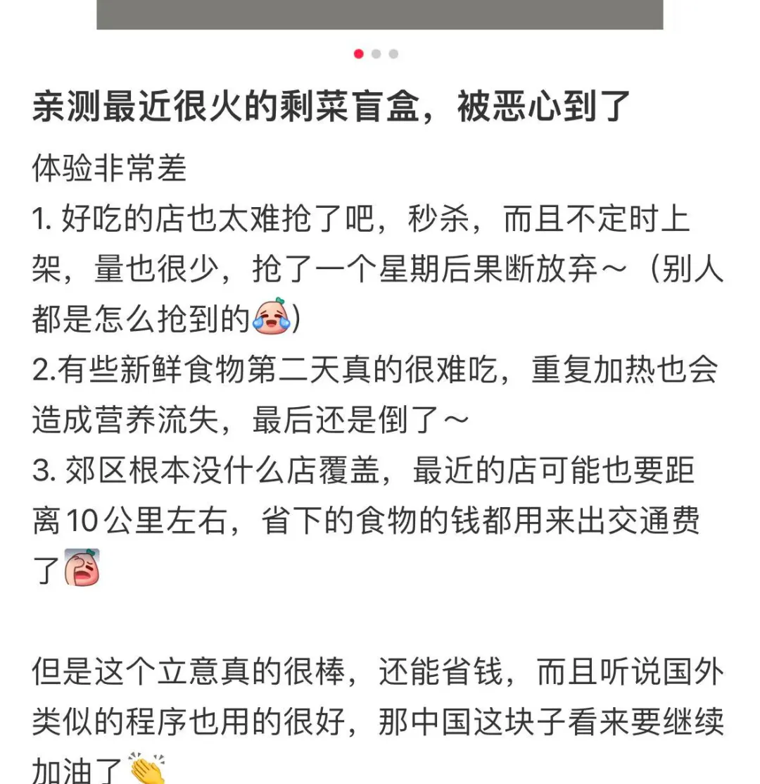 在这些视频里,菜量很大,什么牛排之类的都有,能塞满满一大盒子。但现实中,根本没有,基本上就是真的剩菜,厨师也不会像视频里拍的一样,还在做,基本上都是打烊前的十几分钟,卖完卖不完就那么多。但不管怎么说,既然叫剩菜盲盒,就不能既要又要,如果啥都有了,那就不叫剩菜盲盒了,而从这种模式本质来看,已经实现了双赢,一是普通消费者可以以平价的价格体验到五星酒店的菜品和服务,而酒店也可以将本来要倒掉的食材变现,避免浪费。简单来说,这一模式本身就是解决了痛点的:一是解决了年轻人想吃好的但预算有限的痛点,二是帮助酒店实现降本增效,所以这种模式是值得存在并大力推广的。甚至为了实现更高的效率,一些本地生活平台完全可以做细分的酒店剩菜盲盒整合,实现效益的最大化。那么柴油们怎么看呢?