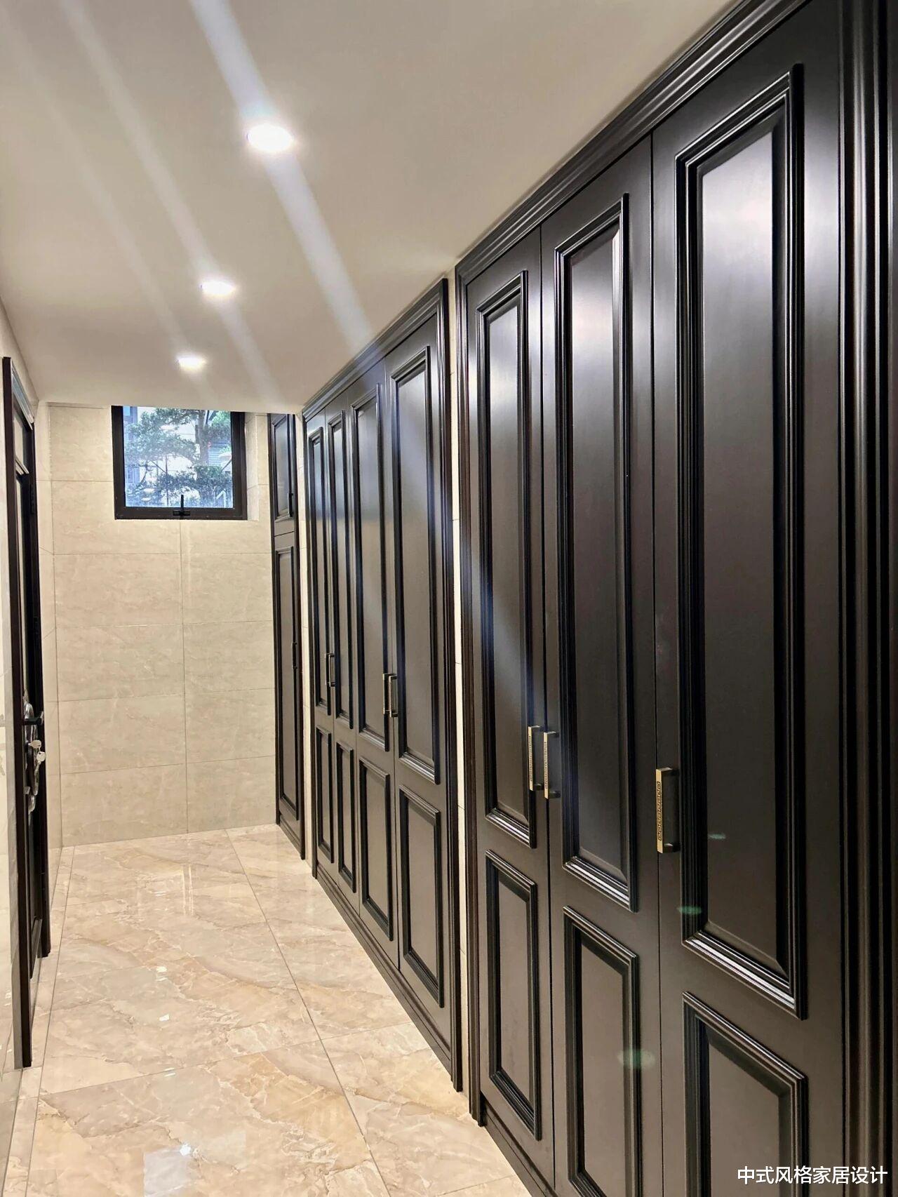 采光井另一侧是酒柜和吧台区。这里有个特别的设计——我们用一扇中式小窗将天井与室内隔开,而不是完全砌墙。这个灵感来源于中国园林的“框景”手法,小窗如同一幅活的画框,将另一侧的竹景纳入视野,随着时光流转,景致也变幻无穷。藏与露的生活智慧在追求美感的同时,我们也没有忽视实用性。负一楼北侧,我们打造了整面墙的收纳柜,容量惊人,家里各类杂物都能找到归宿。我始终认为,一个真正舒适的家,既要展现美感,也要懂得“藏”的艺术。