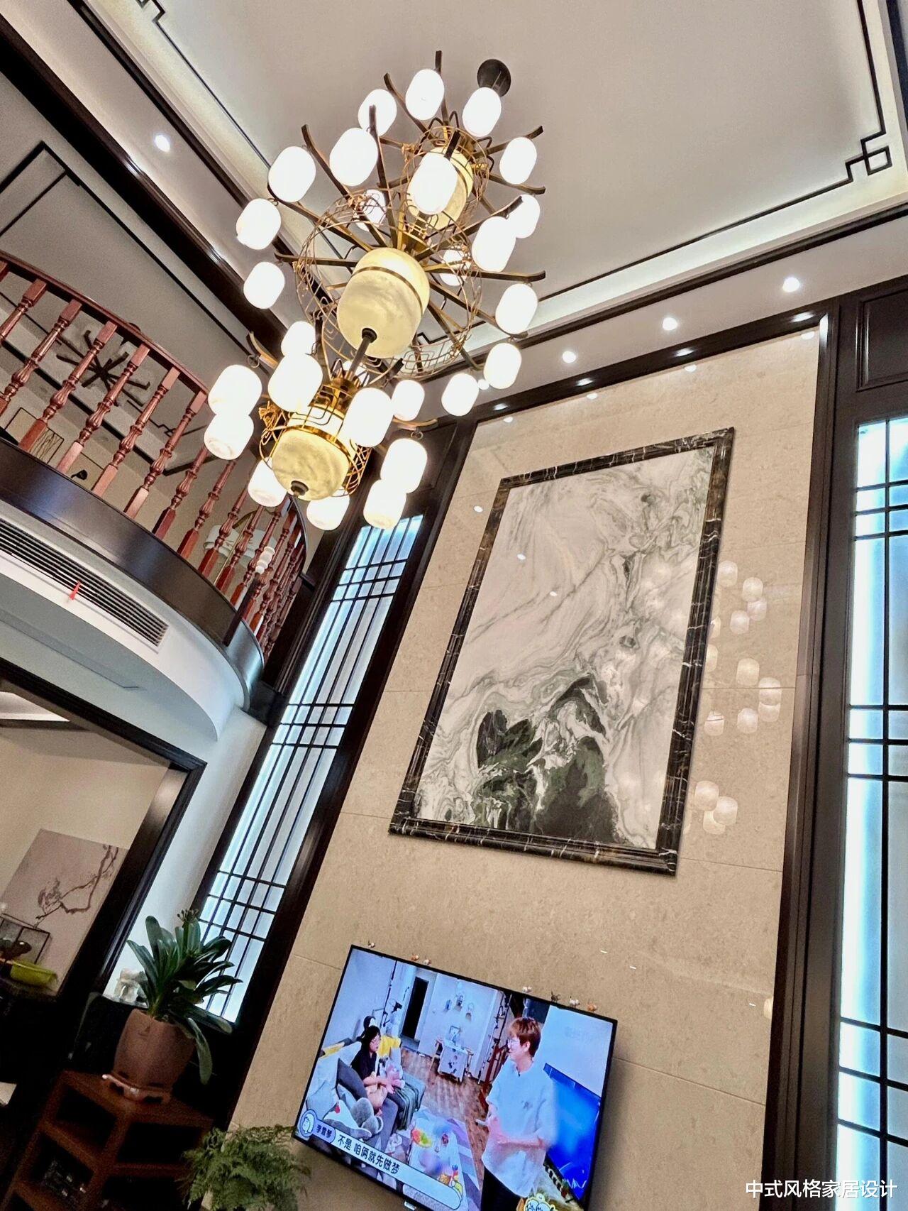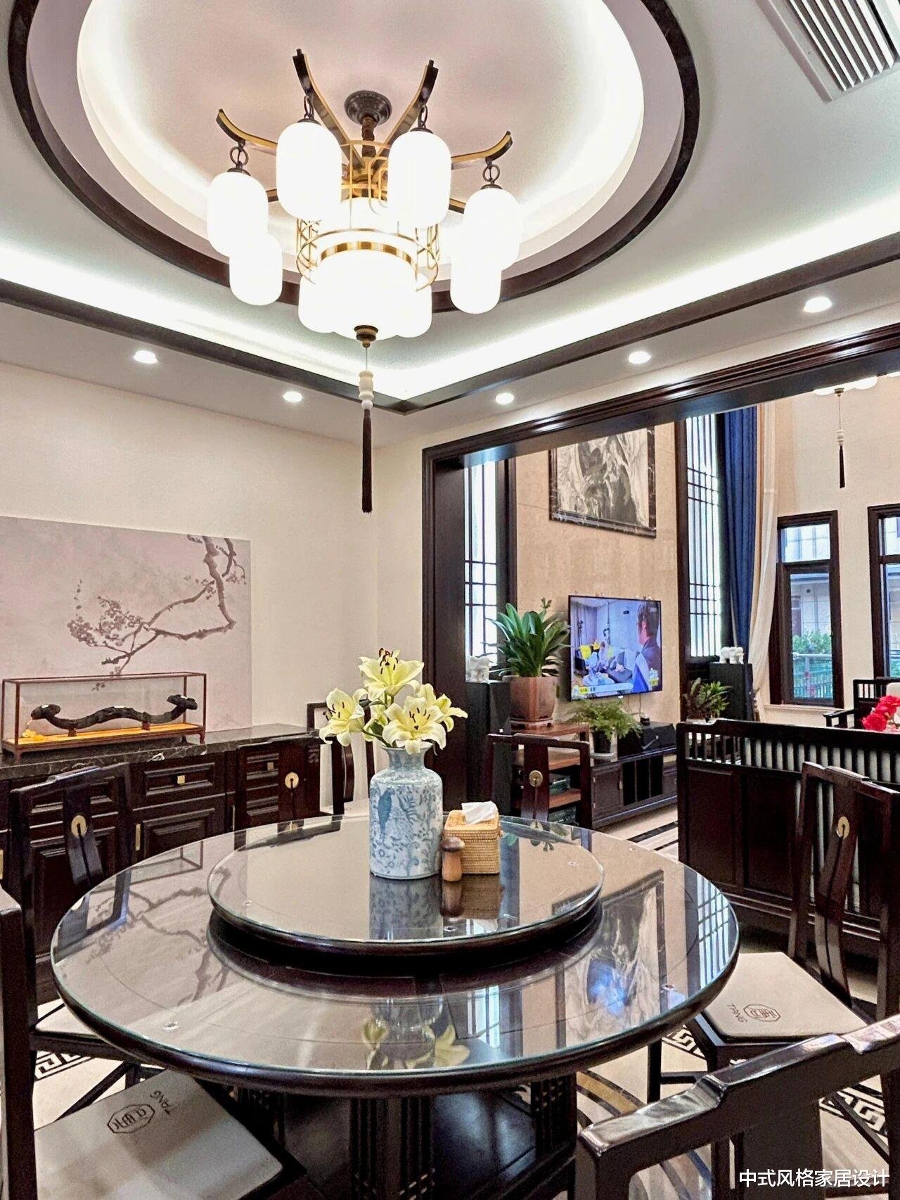抬头望去,吊顶做了精致的双眼皮造型,木线条装饰勾勒出空间的轮廓。一圈灯带和筒灯环绕四周,中间悬挂着我特别挑选的三层三十一头中式大吊灯。每当夜幕降临,灯光透过精致的灯罩洒下温暖的光晕,整个客厅都沐浴在宁静祥和的氛围中。天圆地方:餐厅的和谐之美中国人讲究“天圆地方”,这一理念在我家餐厅得到了完美诠释。装修之初,我们就决定使用圆桌,象征着团团圆圆。为了呼应这一设计,客厅吊顶特意做成圆形,形成上下呼应的和谐关系。