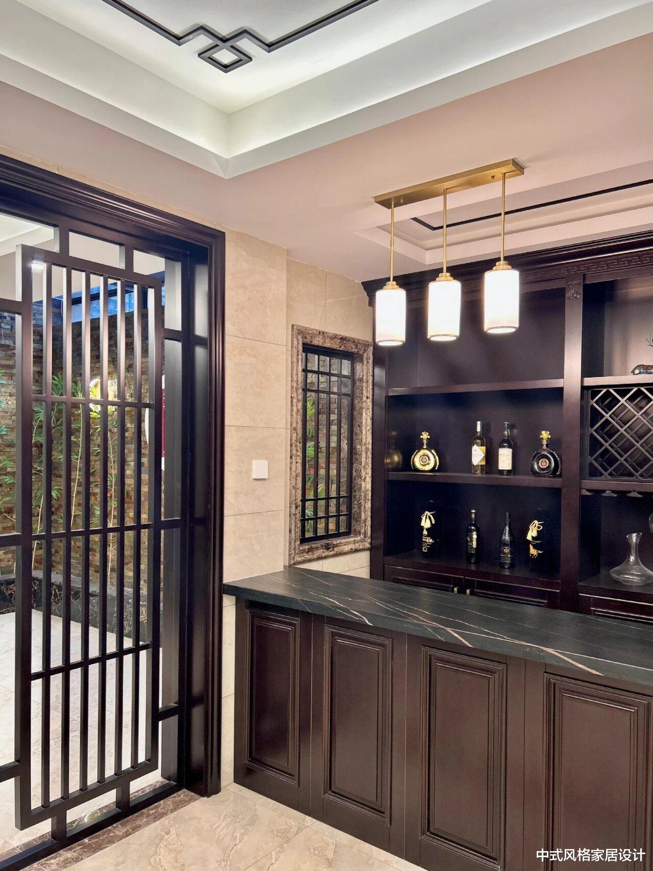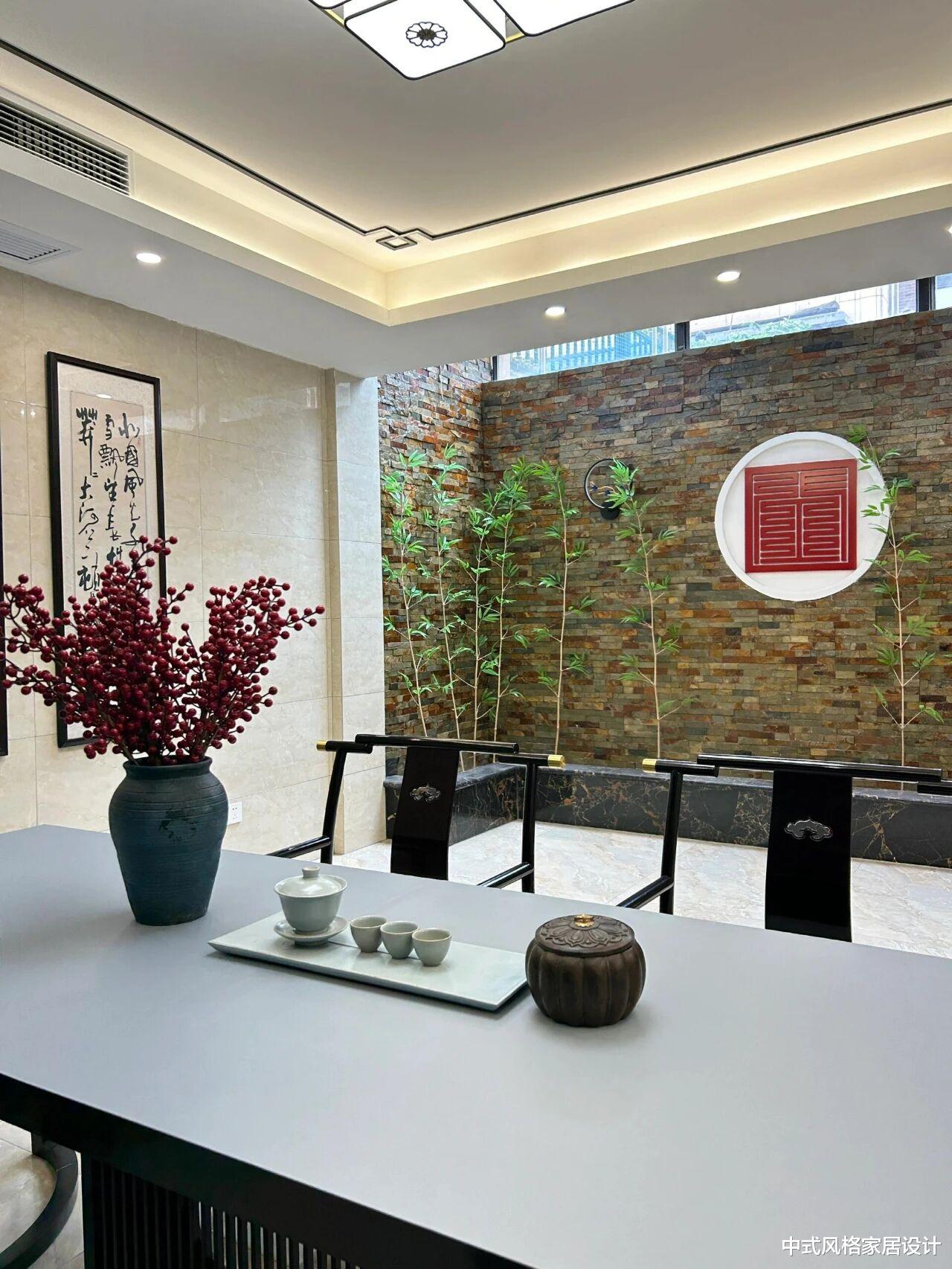 负一楼:茶香酒韵与人间烟火沿着台阶下到负一楼,这里是我最爱的休闲区域——茶室。得益于采光井的设计,即使是地下室,白天也光线充足。茶室的一面墙全部采用仿古砖,墙中央的红色图案出自我父亲的手笔。他老人家对传统艺术有着独到的理解,这个设计为整个空间注入了灵魂。