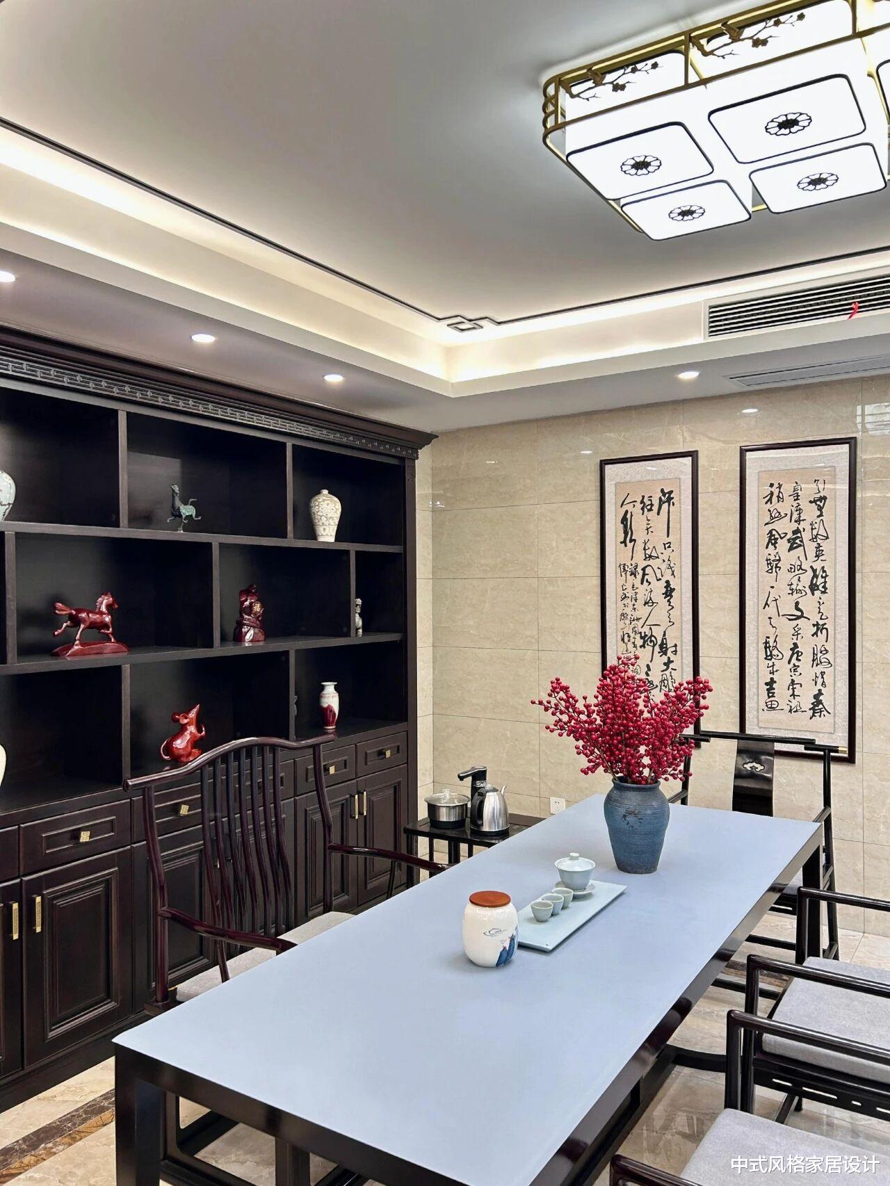 靠墙位置,我们设计了一排餐边矮柜。曾经纠结过是否要做高柜,但考虑到家中整体木作颜色偏深,最终还是选择了矮柜,避免空间显得过于压抑。柜面上摆放着一柄如意和一幅水墨挂画,简单的装饰却营造出雅致的意境,每每用餐时都感到心旷神怡。