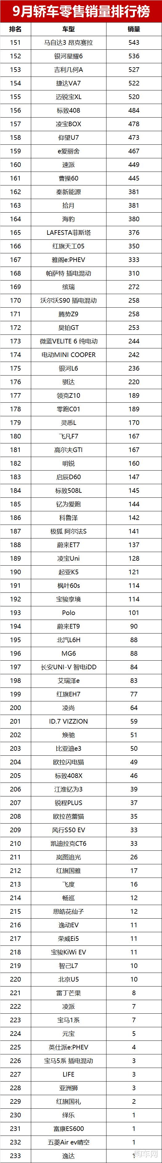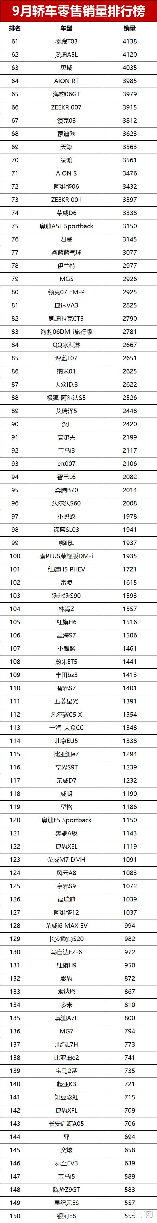 【2025年9月轿车零售销量排行榜 完整版】近日,乘联会公布了最新月度乘用车销量数据。数据显示,2025年9月份国内轿车市场零售销量达到101.8万辆,同比增长4.6%,环比8月份增长12.7%,“金九”效果凸显。9月份销量破万辆的轿车达到35款车型,其中销量超过2万辆的车型有13款。新能源车型表现强势,包揽榜单前三名且前十席中占据七席;燃油车虽未进入前三,但仍保持稳定输出,共有15款燃油轿车销量破万辆,轩逸夺得燃油轿车销冠,同时也是销量最高的合资燃油轿车车型。9月轿车零售销量榜!第1-233名,星愿亚军,轩逸第四,冠军超5万辆!
