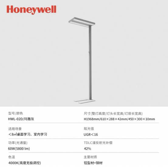 霍尼韦尔这款护眼大路灯模拟太阳光设计,4000K 色温接近上午 10 点阳光,光线明亮且不刺眼,显色指数达 98,高度还原物体色彩。经德国 TüV 频闪蓝光认证,无蓝光频闪危害。立式设计让光源如太阳般照亮空间,矩形照射范围广,内部双梯形结构搭配高反光材料,照明效率高,灯罩底部微菱晶板使光线更柔和。不过,它也存在不足,光线偏强,有轻微重影与频闪,光谱中蓝光峰值 0.6 且未添加有益红光,外观为尖角设计易磕碰,操作仅有无极调光旋钮,缺少遥控器 。