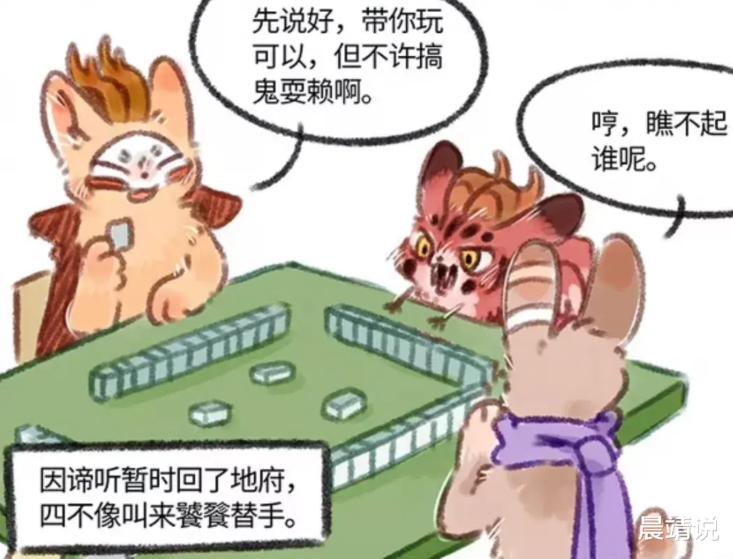 谛听因为自带降温的属性,导致四不像他们冷的受不了。不得已,只好放弃热爱的麻将,暂时回了地府。山中的日子是清闲的,但是也是无聊的。打发时间的项目,三缺一。不得已,四不像叫来了饕餮当替手。麻将开始前,四不像对着饕餮耳提面命,带你玩可以,但不许搞鬼耍赖啊。