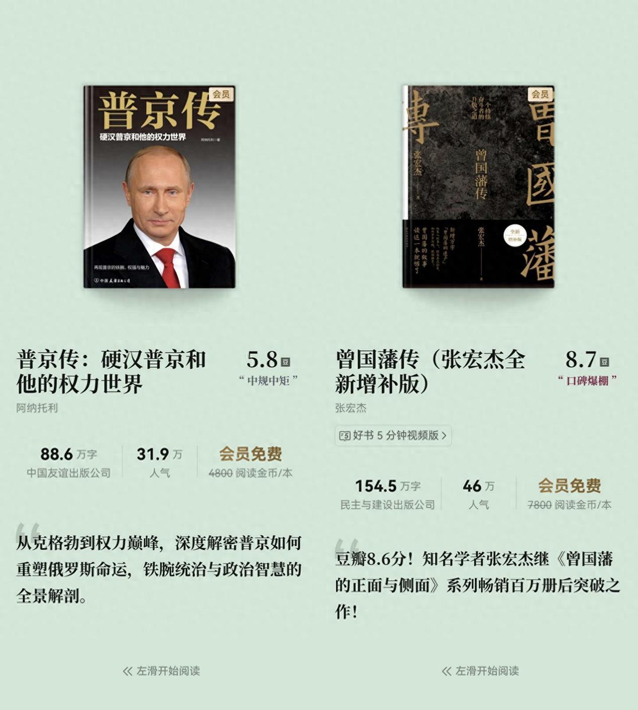 作为“传记爱好者”,以前看到书总纠结“要不要买”。想知道普京是怎么在权力场站稳脚跟的,又怕书太厚读不完浪费钱;好奇曾国藩是怎么从“笨人”逆袭成晚清重臣的,却纠结单独买一本书不划算。现在华为阅读VIP一开,这些顾虑全没了。一个月会员费还没一杯奶茶贵,像是机械工业出版社,理想国这些大社的书都能随便看。别的不说,光这两本传记就值回“票价”了,更别说还有几千上万本精品好书等着翻。