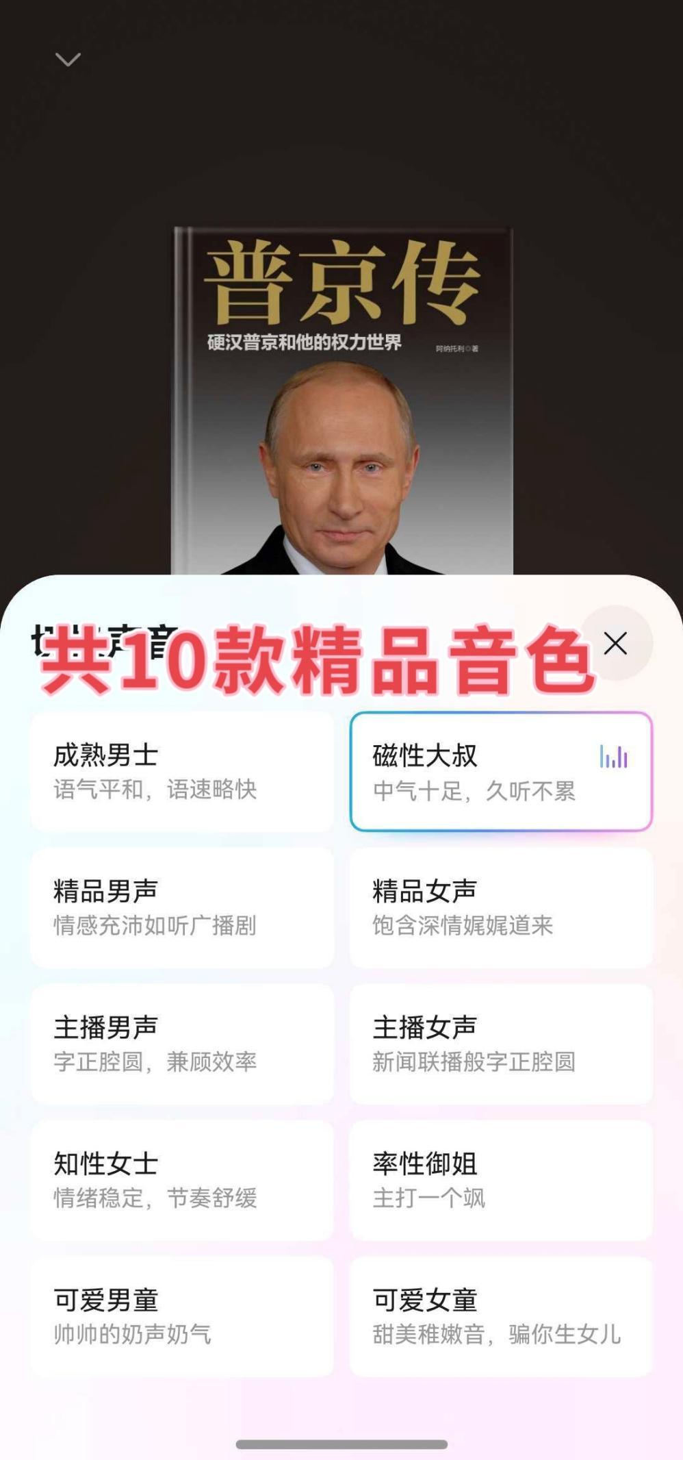 最常用的是华为阅读的“懒人功能”,白天挤地铁,我就开着“精品音色”听《普京传》,选了“磁性大叔”的声音,那音色低沉又有质感,连呼吸和停顿都自然又清晰,就像真人在你耳边念书,那感觉比刷短视频还上瘾。晚上躺床上看《曾国藩传》,举着手机嫌手酸,就把手机放支架上,打开“AI眼动翻页”,盯着页面底部动动眼球,它就能自动翻篇了,不用动手划来划去,连我妈见了都说这高科技真省事儿。