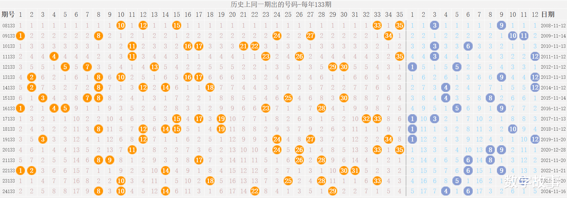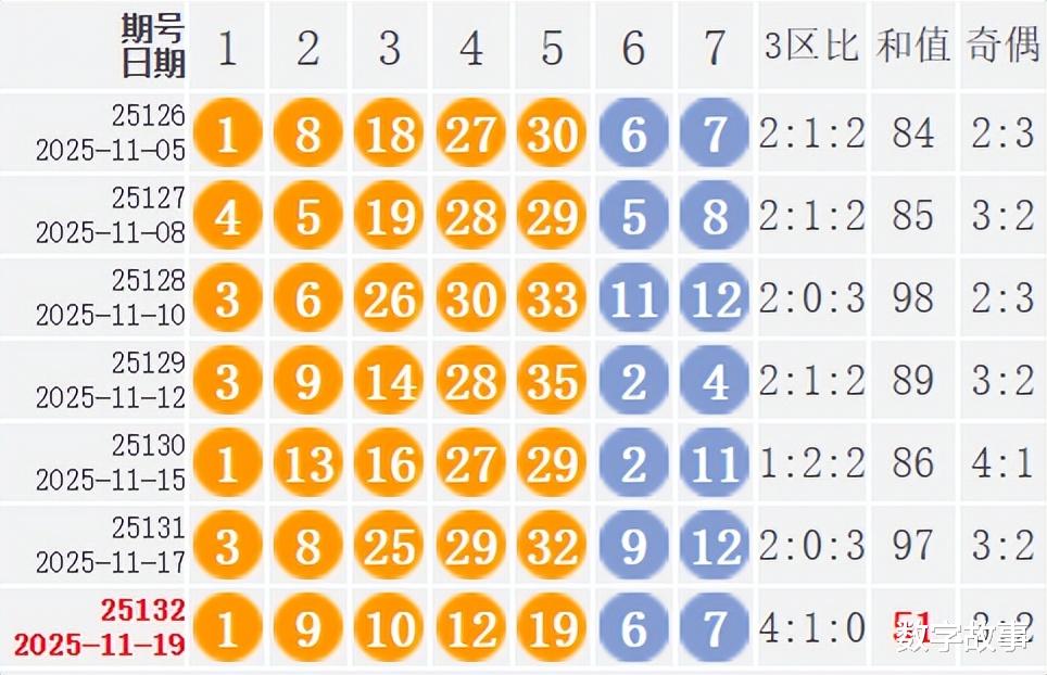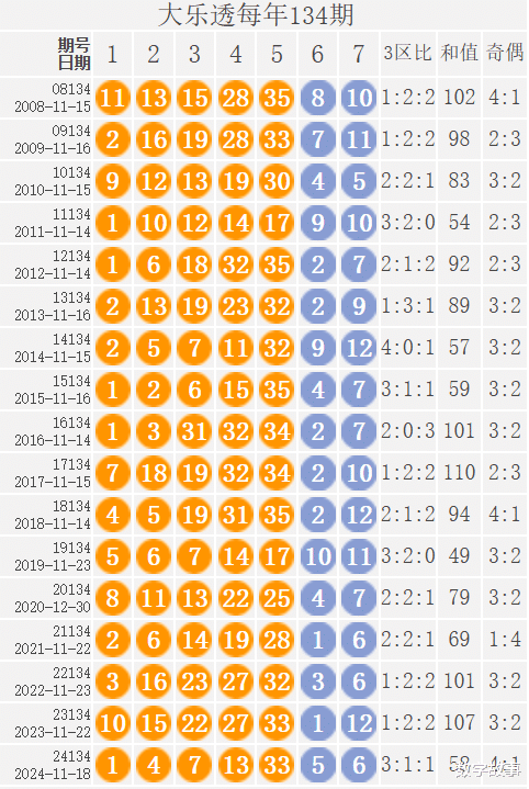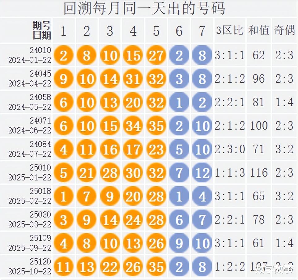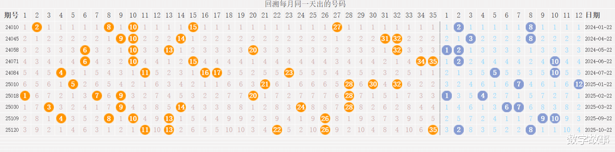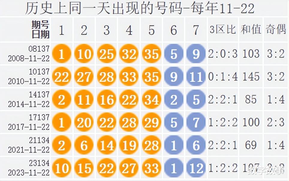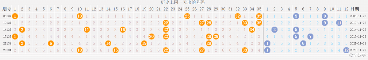 博弈心理,挑战概率: 看近期开奖号码,也可看历史数据统计!【大乐透25133期多角度冷热号】大乐透25133期四维走势图,前后区号统计及冷热号1) 历史同一天:11月22日 (共6期)