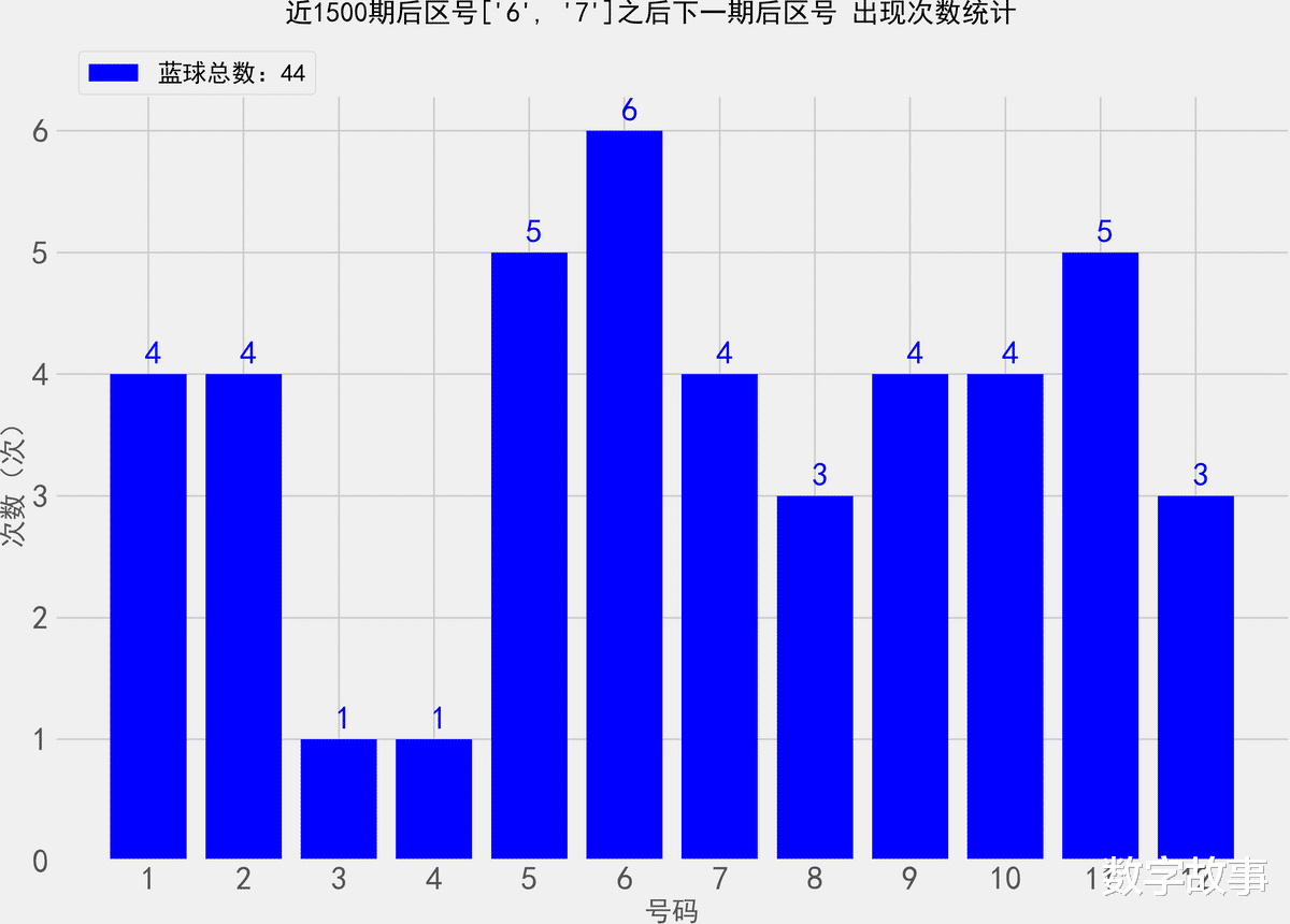 统计近1500期后区号6-7之后, 各后区号的出现次数大乐透25132期后区号是6-7找出近1500期后区6-7号之后,下一期出现的所有后区号,统计其出现次数。除开这一期,共出现了22次6-7后区号那么统计的样本数据是44个