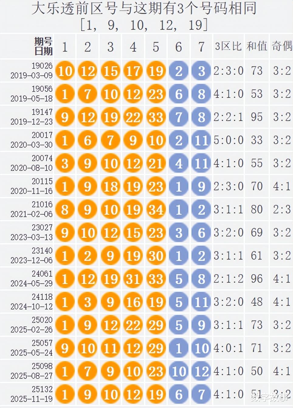 大乐透25132期前区号在过去是否出现过?大乐透25132期前区号: 1-9-10-12-19经查,历史上没有出现过与这一期5个前区号或者4个前区号一样的。与这一期3个前区号一样的有42期,取近15期如下: