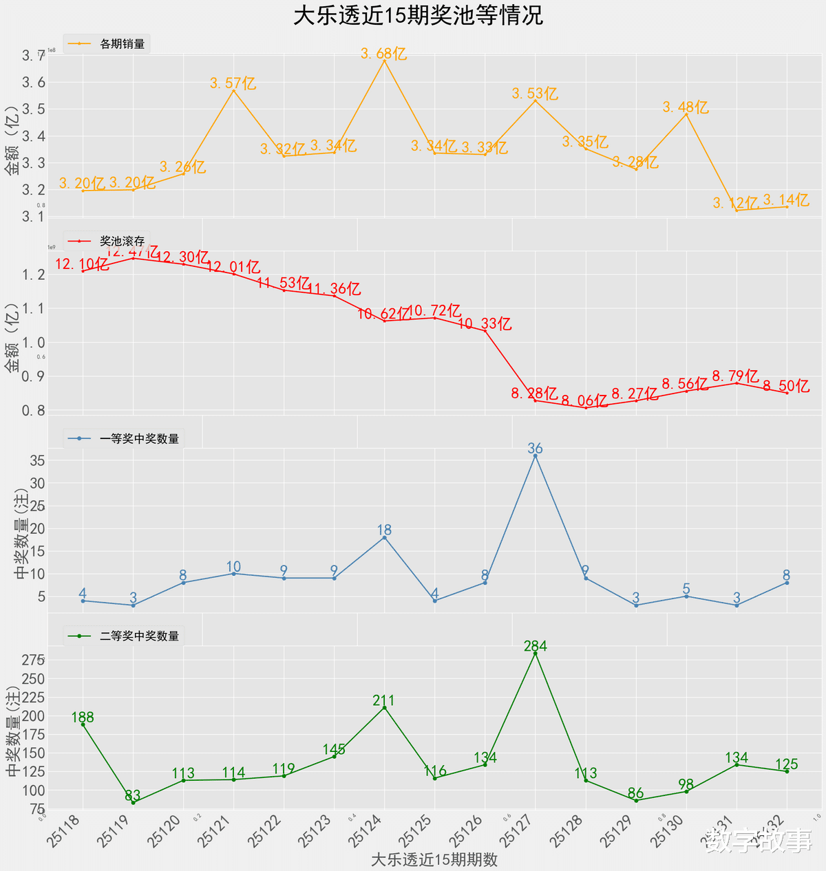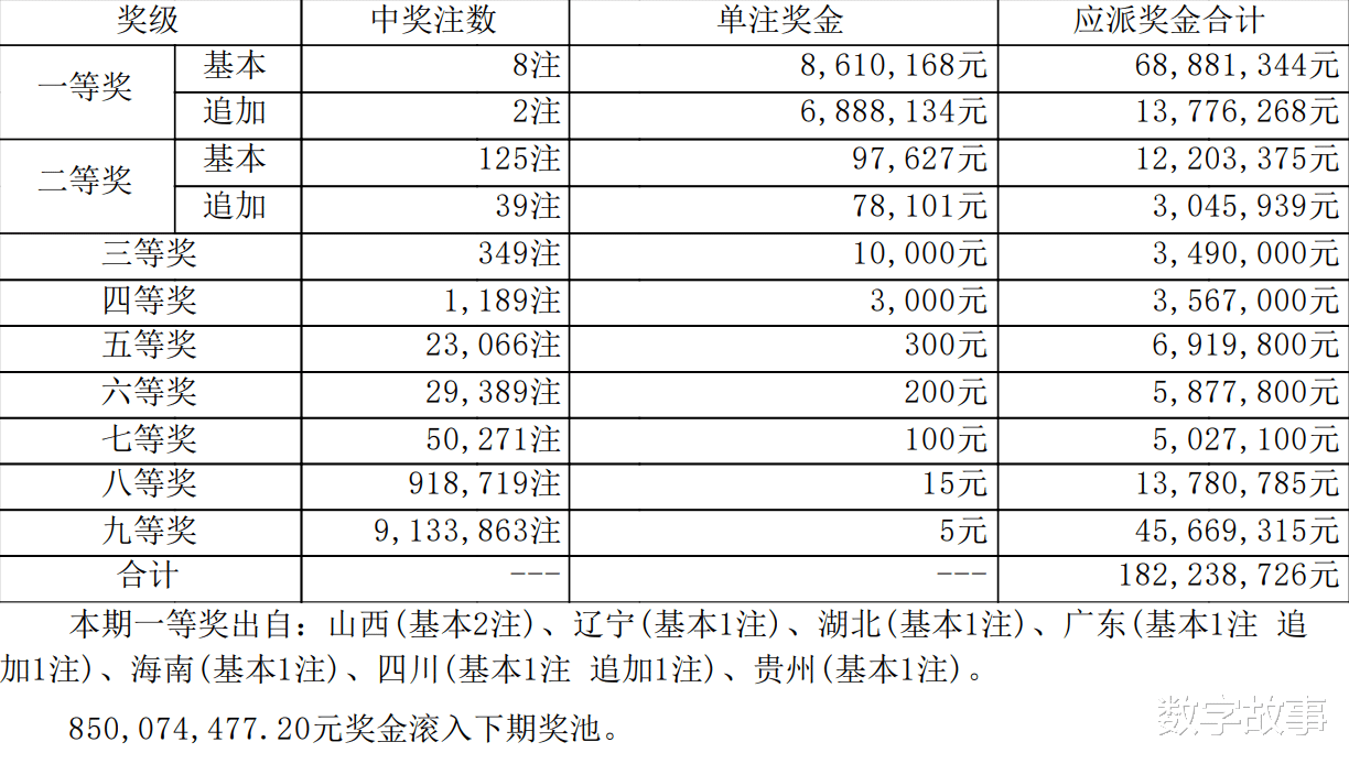 大乐透25132期一等奖:8注,追加: 2注二等奖:125注,追加: 39注。本期全国销售金额:3.136 亿 奖池滚存:8.501 亿.近15期奖池滚存, 中奖情况等信息: