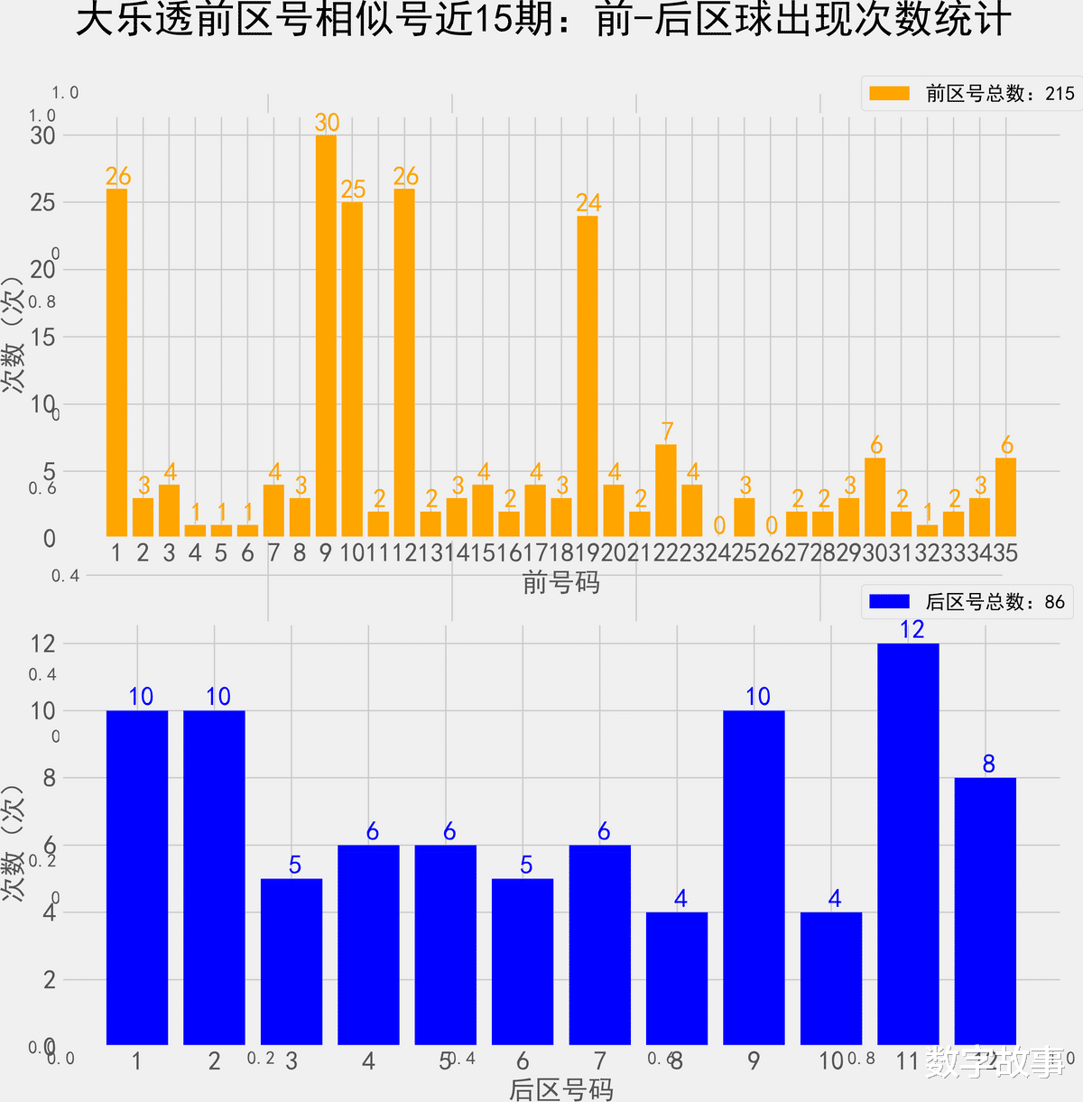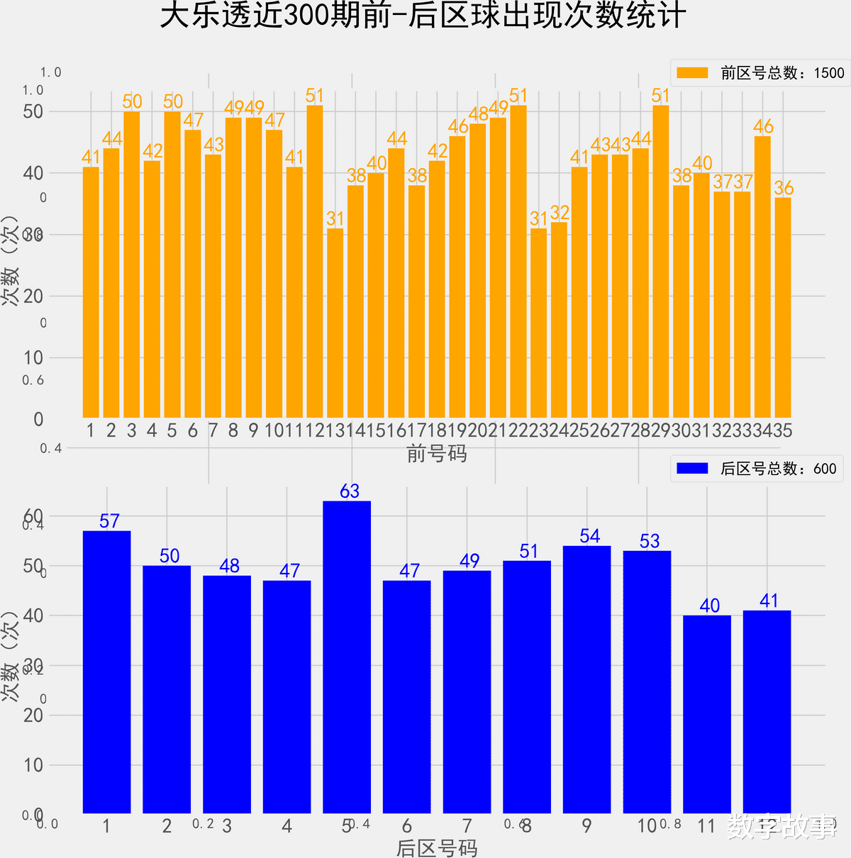 大乐透近300期前后区号统计情况统计样本数据: 1500个前区号码 600个后区号码