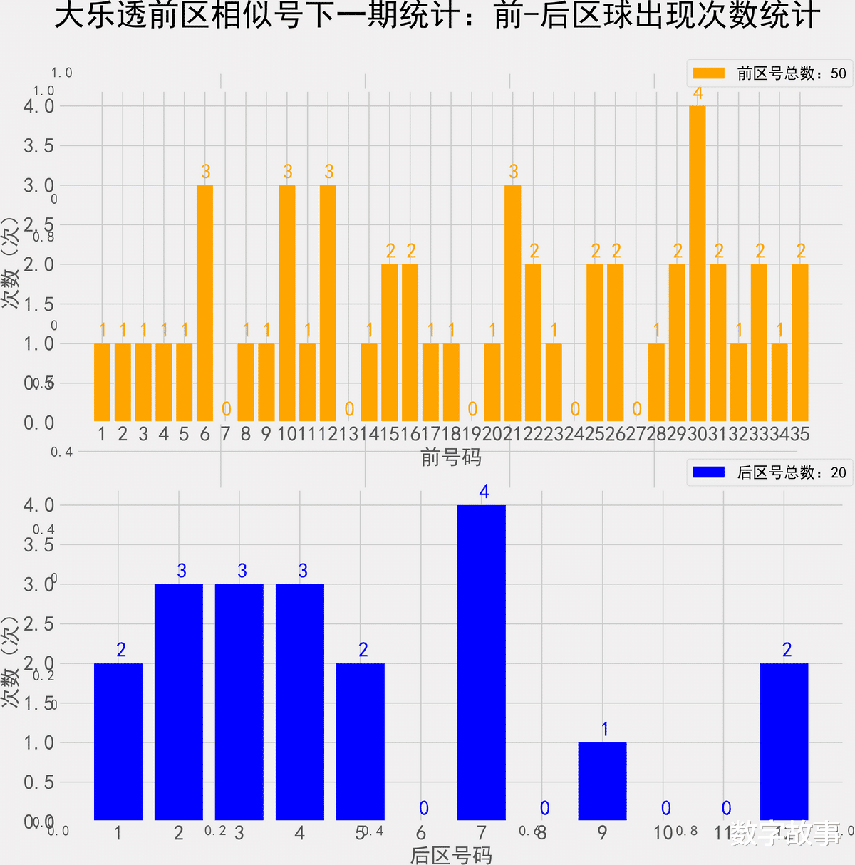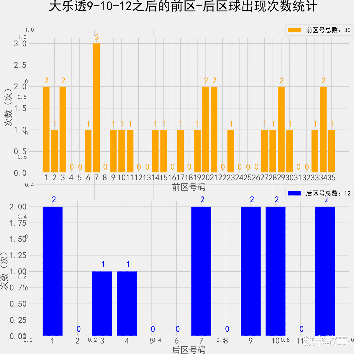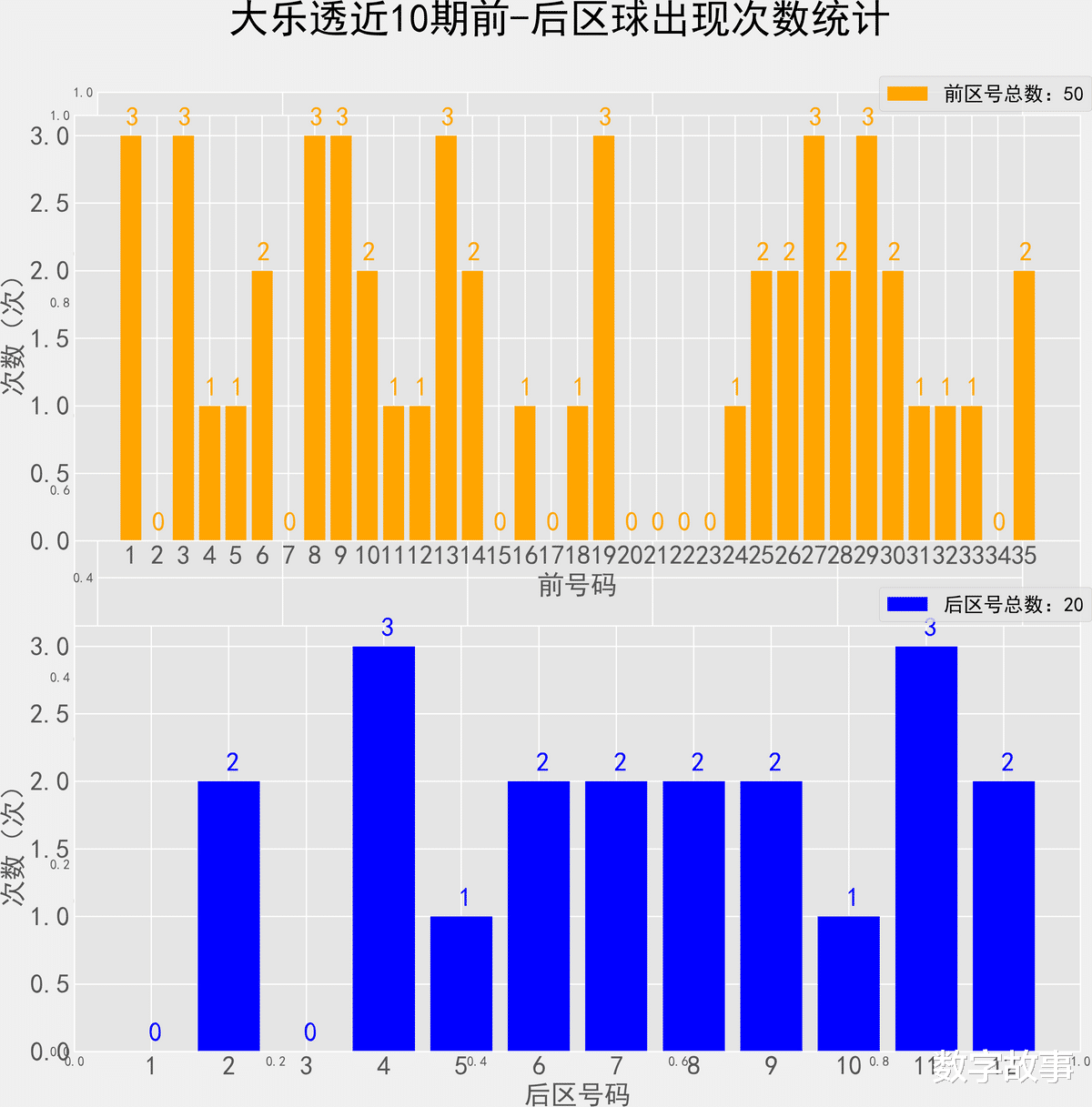 大乐透近10期前后区号统计情况统计样本数据: 50个前区号码 20个后区号码