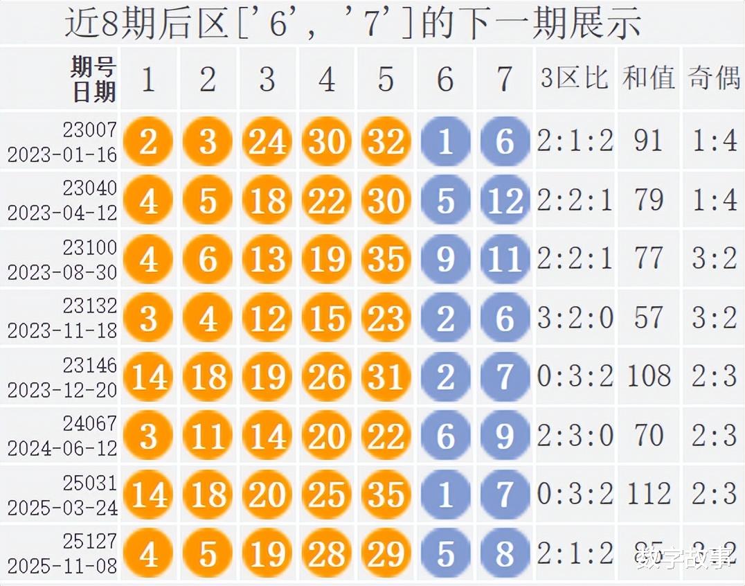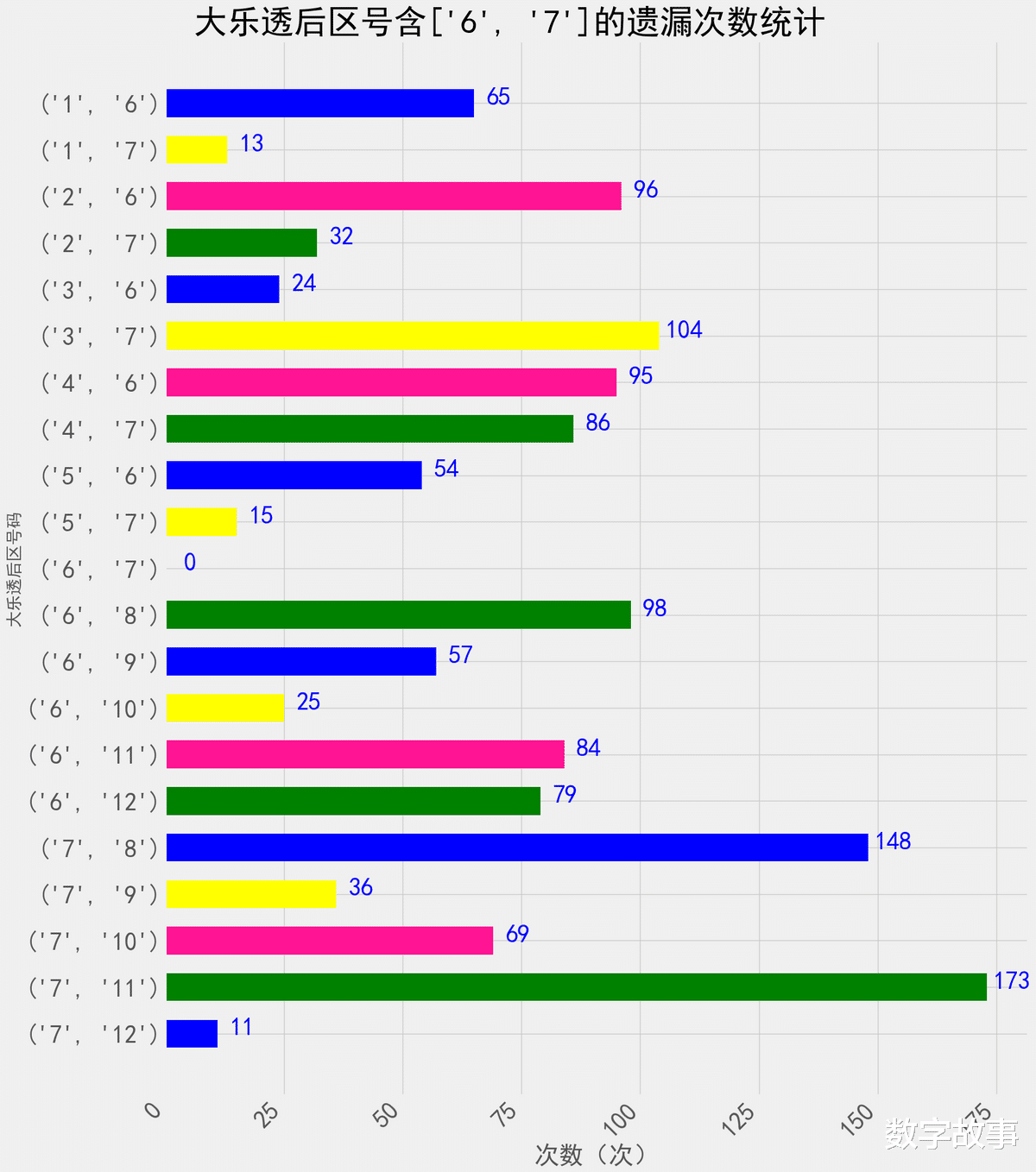 大乐透后区含6或7的双号遗漏次数统计大乐透后区组合6-7近150期出了3次,这次中断了5期遗漏。