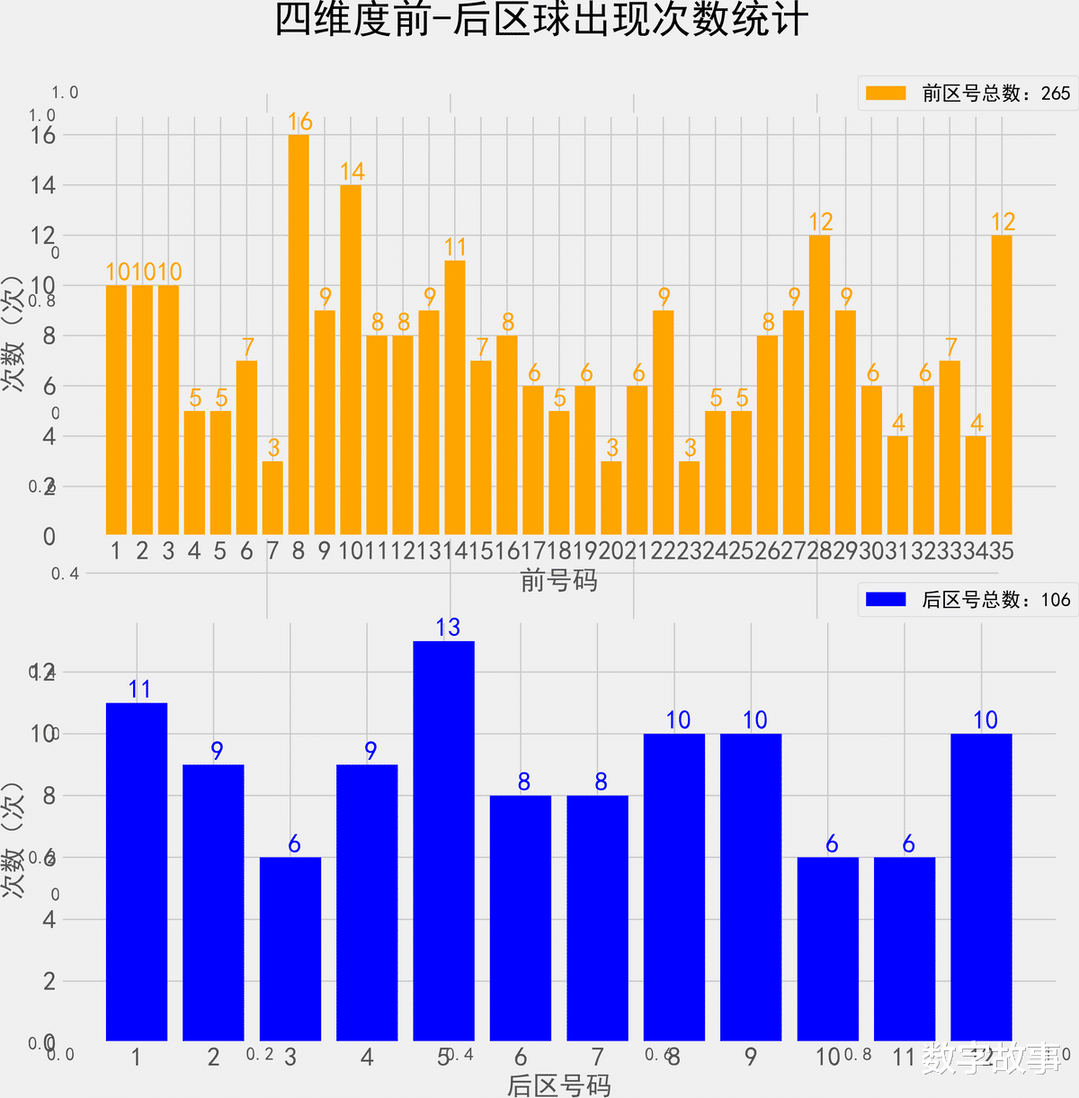 => 统计出现概率综合以上4个纬度的号码,共53期根据出现次数,分为热号,冷号,其他的为温号。统计样本数据: 265个前区号码 106个后区号码
