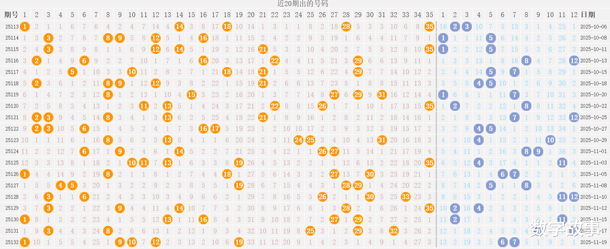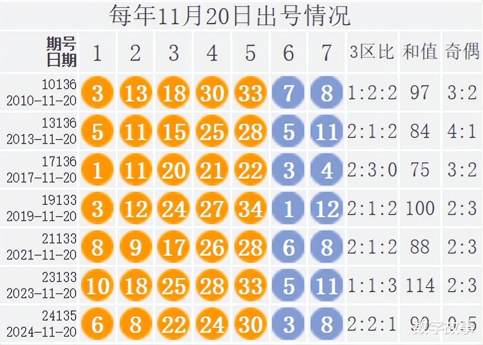 【其他历史数据查询统计】大乐透历史上的今天2025-11-20 星期四 大乐透不开奖每年11月20日出号情况: