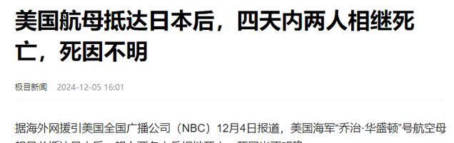 信息来源:极目新闻--美国航母抵达日本后,四天内两人相继死亡,死因不明2024-12-05