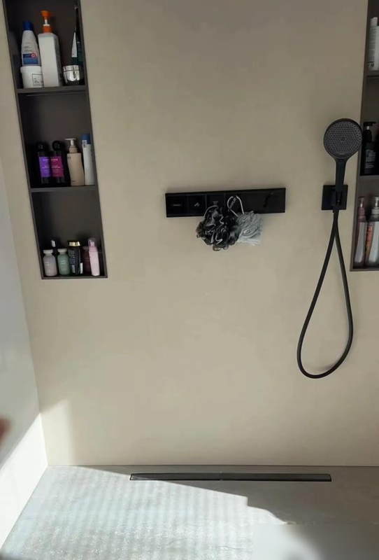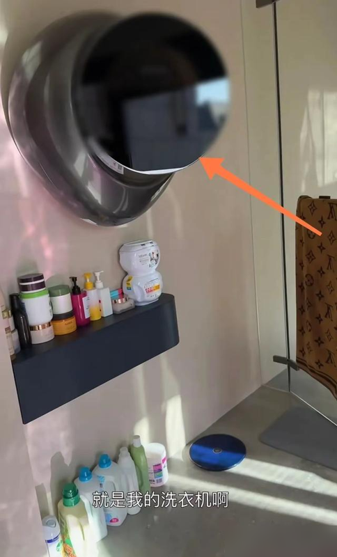 更“刺激”的是淋浴区:黑色花洒配壁龛,LV毛巾随意搭在毛巾架上,官网价超2000元的奢侈品,在王灿家只是“擦手布”;墙上还挂着一台3000元的壁挂洗衣机,专门洗小件衣物——明星的“精致”,连洗衣都要分个“高低配”。