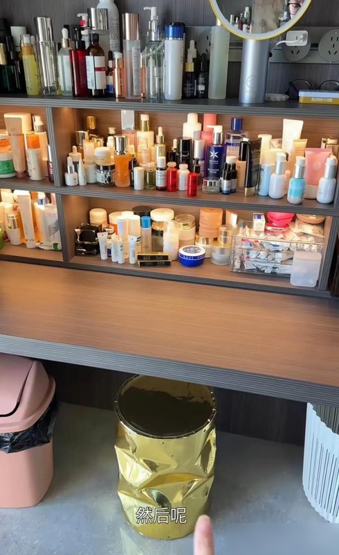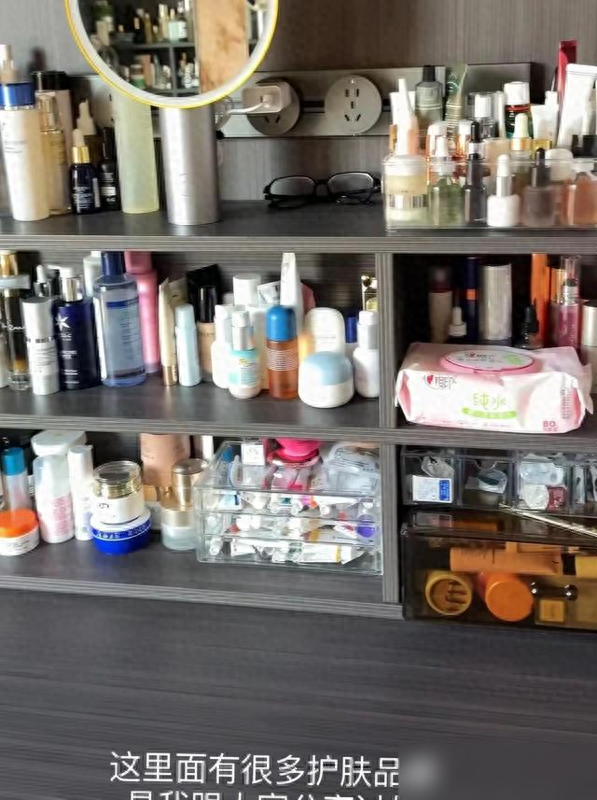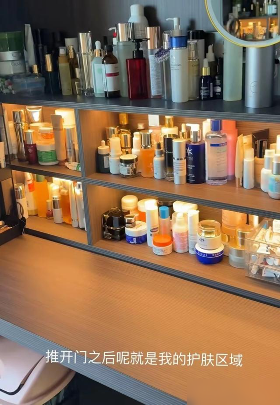 走进浴室,王灿的护肤区最先“击垮”普通女孩——护肤品堆得像“三层小楼”,瓶瓶罐罐全是叫不上名的高端品牌。