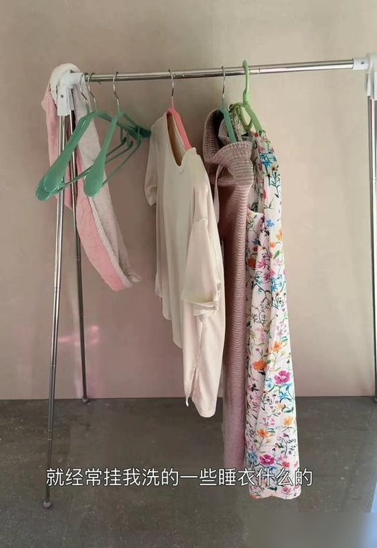 更有意思的是,浴室里的“反差感”处处可见:一边是堆成“小卖部”的睡衣(几十件款式不重样,一天换一件能穿一个月),一边是不锈钢衣架上随意挂着的便装;一边是展示柜里的奢侈品包包(带氛围灯,像专柜),一边是朋友送的手办被小心收纳。