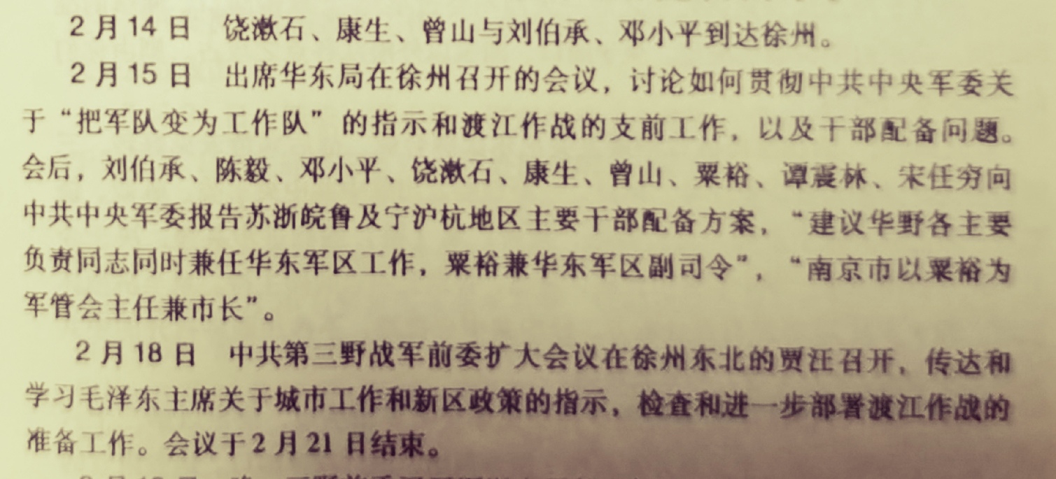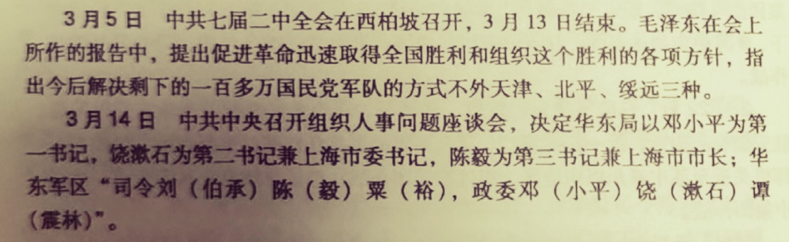 3月14日,中共中央在党的七届二中全会胜利闭幕后,召开组织人事问题座谈会,决定华东局以邓小平为第一书记,饶漱石为第二书记兼上海市委书记,陈毅为第三书记兼上海市市长;华东军区“司令刘(伯承)陈(毅)粟(裕),政委邓(小平)饶(漱石)谭(震林)”。这样,中央根据二野、三野共同经营华东的方针,确定了华东局、华东军区、上海市委、上海市政府的主要领导人。粟裕也就被明确为华东军区副司令员兼三野副司令员及第二政委,在陈毅不在三野期间继续代理其党政军职务。