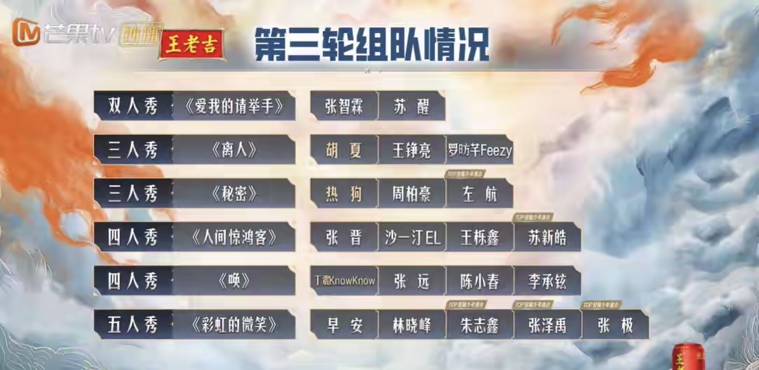 这一次他们终于被拆开了,朱志鑫、张极、张泽禹和早安、林晓峰组成了新的队伍,他们的演唱曲目是《彩虹的微笑》。