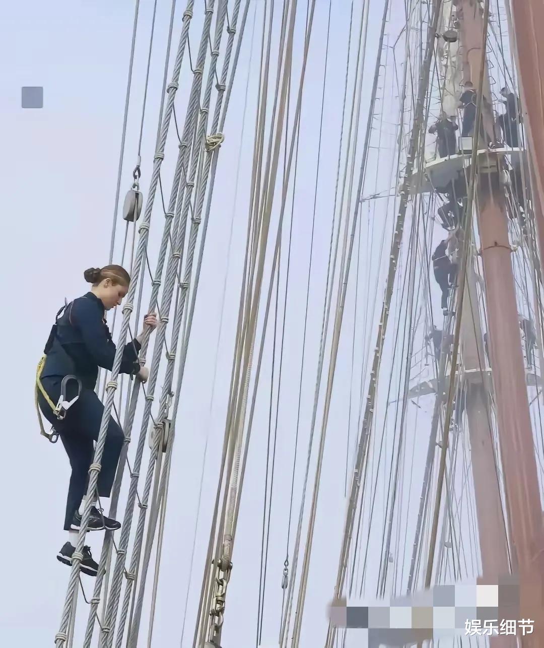 登顶后,趴在桅杆上的莱昂诺尔,开心得都要飞起来了,这模样实在太帅气了。
