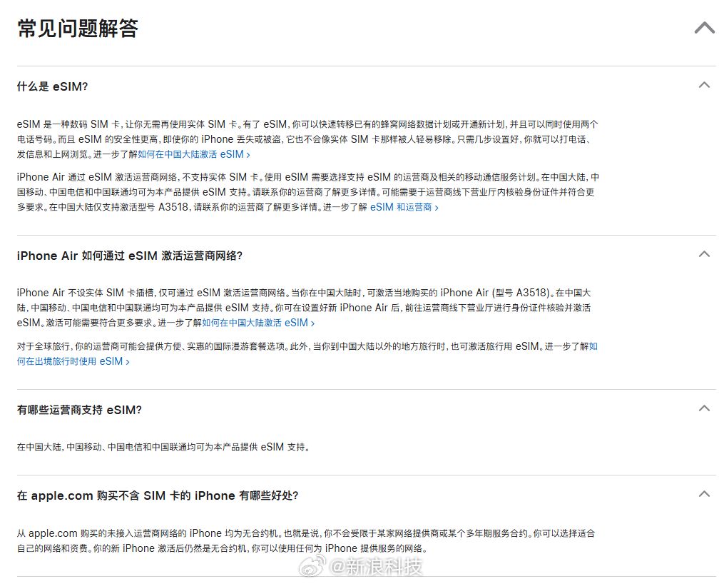 值得注意的是,苹果中国官网今日同步更新了iPhone Air的常见问题解答,明确澄清了用户最关心的合约问题。官方强调:“在中国大陆,三大运营商均可为iPhone Air提供eSIM支持。从apple.com购买的未接入运营商网络的iPhone均为无合约机。你不会受限于某家网络提供商或长期服务合约,可自由选择适合的网络与资费方案。激活后,设备仍保持无合约状态,可随时切换支持iPhone的运营商。”