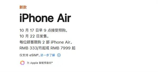 此前,由于国内三大运营商在eSIM服务上的政策限制和技术适配尚未完全成熟,iPhone Air原定与iPhone 17系列同步发售的计划一度搁浅,官网信息甚至标注为“发售信息后续更新”,引发市场对“eSIM落地受阻”的猜测。如今正式官宣,表明苹果已与工信部及中国移动、中国联通、中国电信达成深度合作,相关服务支持体系基本就绪,这不仅是技术突破,更是生态协同的结果。
