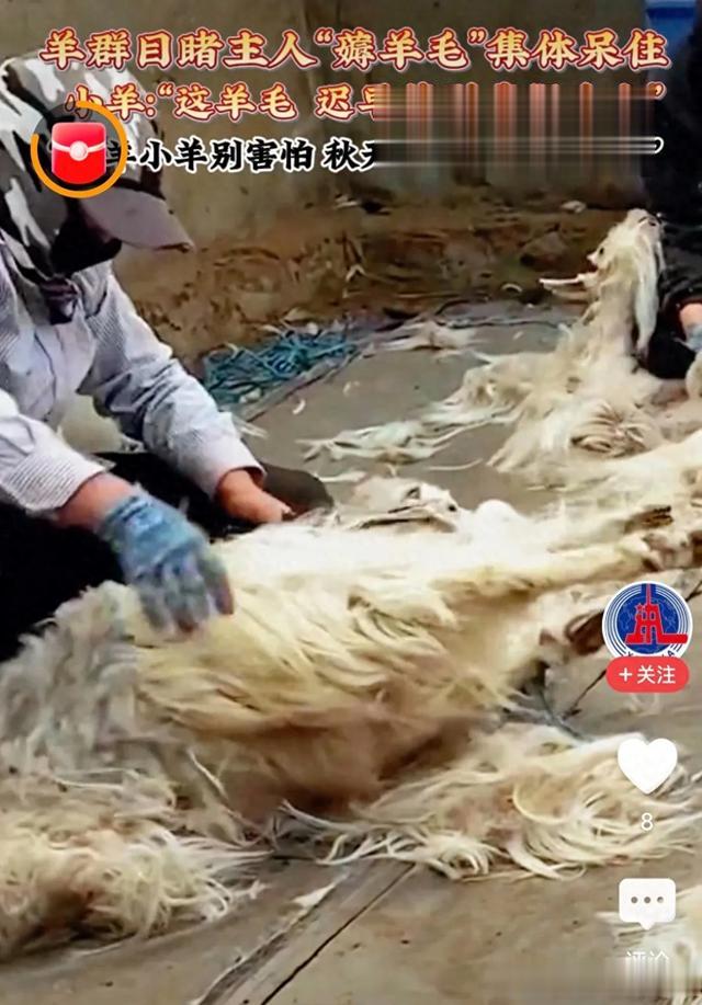 一位网友发布了一个视频:羊群目睹主人薅羊毛集体呆住, 小羊:“这羊毛 迟早薅到我们头上”。