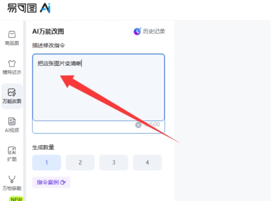 操作流程:进入AI万能改图功能并上传照片。然后在指令描述框中,描述你的修复需求。例如: