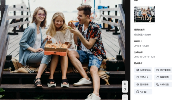 如果我们的照片不仅模糊,还有污渍、褪色甚至局部破损等更复杂的问题时,便可以使用AI万能改图功能,只要输入简单的文字指令,来告诉AI具体要修复什么,便能轻松实现照片修复。