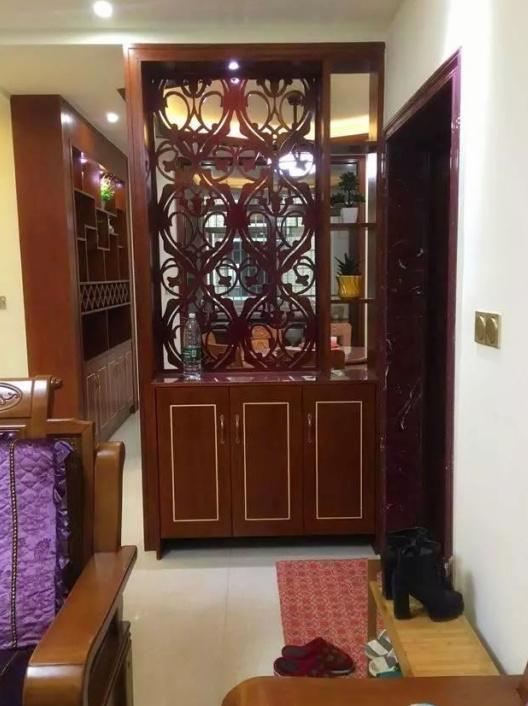 大家看看吧,如果你们的婚房是这个样子,你们能开心吗?这是玄关,做了个隔断,款式还是挺漂亮的,但是这颜色实在无法接受