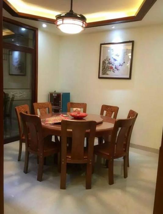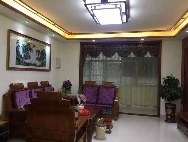 客厅,装修和家具都老气横秋的,感觉很压抑,没有一点温馨舒适的感觉。沙发背景墙上还挂了一幅山水画,这都是80年代的风格了,现在连农村都没有人会挂这种画了