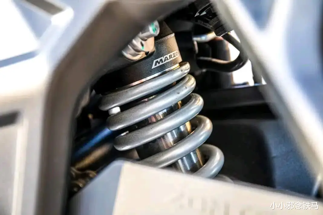 悬挂系统是由著名品牌玛佐奇(Marzocchi)提供。前悬挂为43毫米倒置前叉,预载、压缩和回弹阻尼均可完全调节,行程为180毫米。