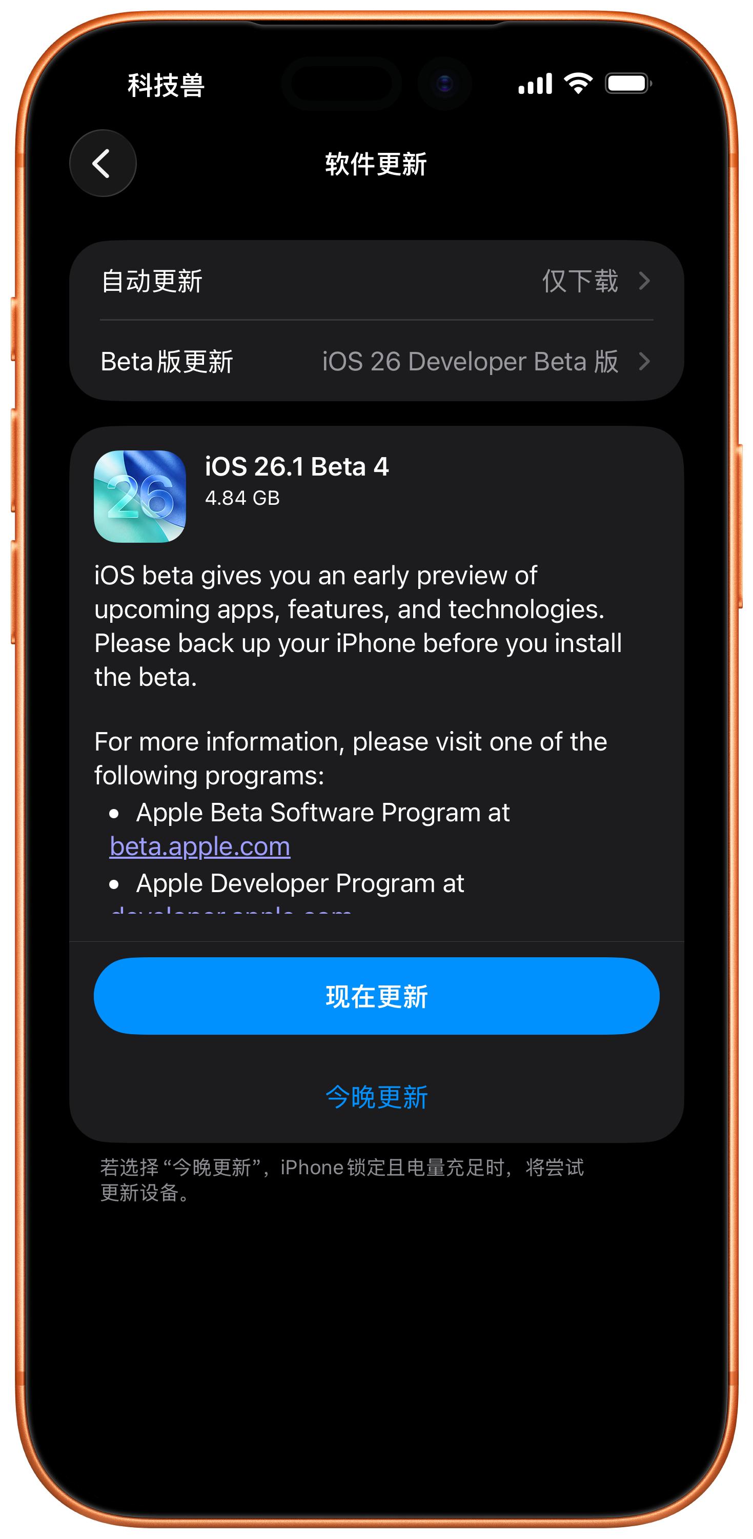 10 月 21 日凌晨苹果发布了最新的开发者测试版更新,包括 iOS 26.1 Beta 4 等在内。预计这些版本的公测版将在明日推送给参与公测的用户。