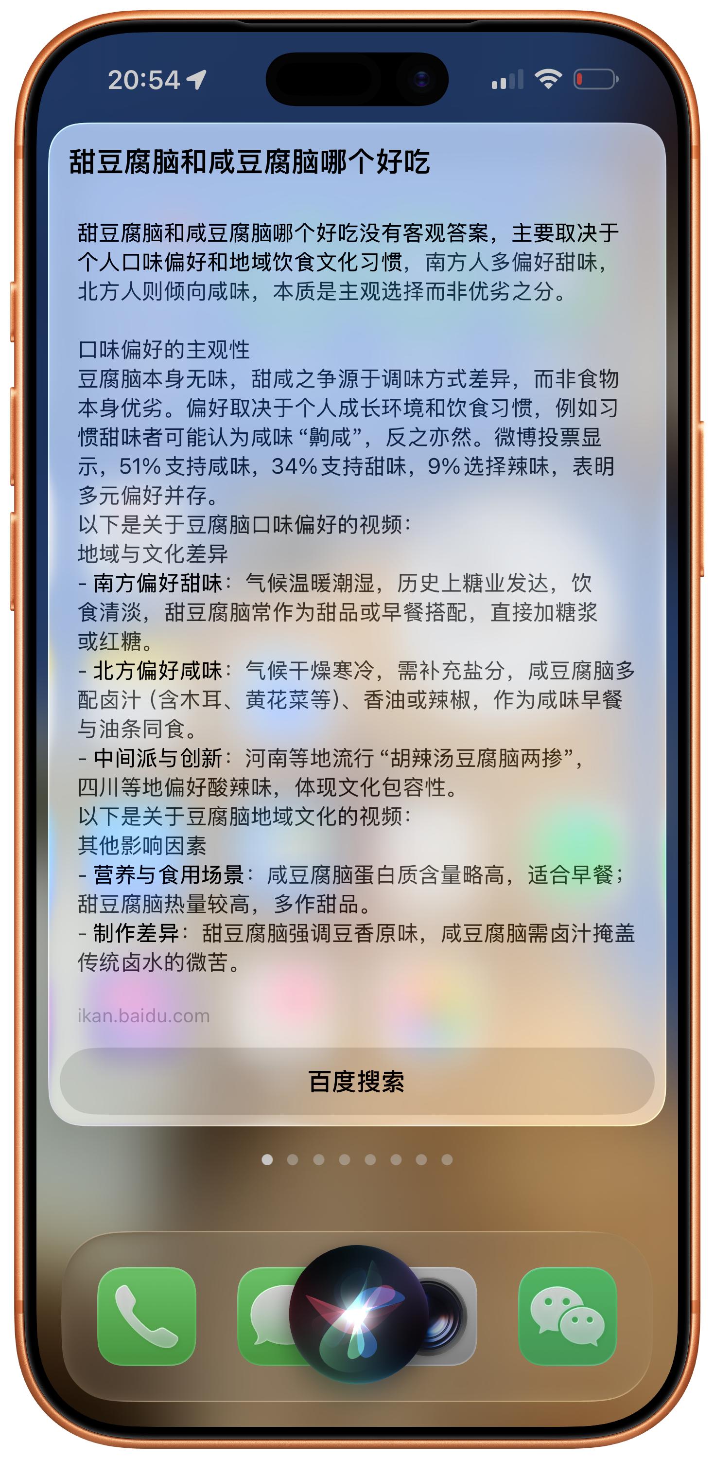 此前,Siri 遇到复杂问题时通常会提示百度搜索,但现在,对于一些问题会直接返回完整的回复(依然来自百度)。