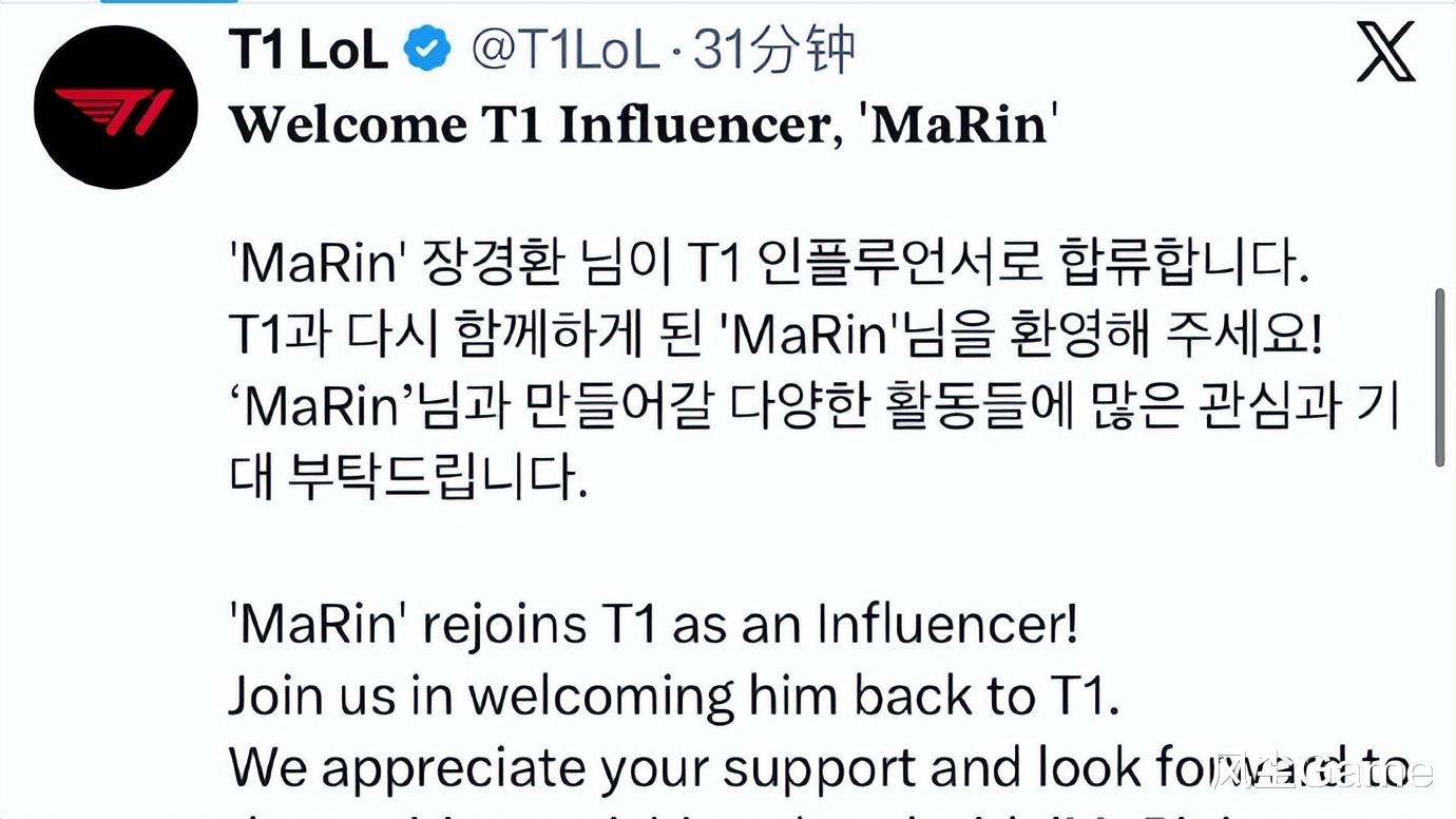 LCK赛区第二赛段常规赛,马上就要开赛了,T1作为揭幕战参赛队伍,首场比赛要交手KT,这场通信社大战,不用看都知道结局,KT作为最稳定的充电宝,能打满三局,就已经算是成功了,比赛开打的前一天,T1战队还宣布了一个新消息:S5世界冠军上单Marin,以创作者身份重返T1。