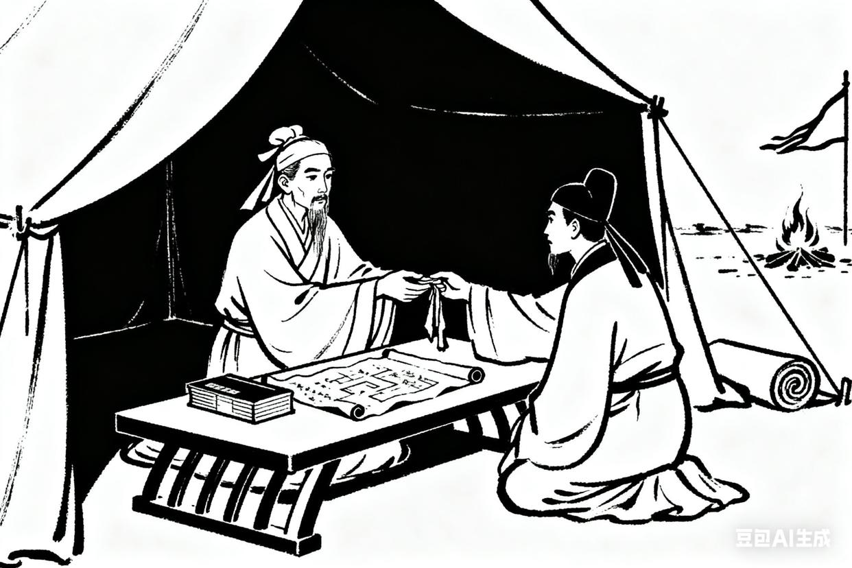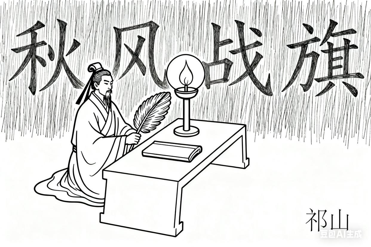油灯如豆,映着案上的《出师表》。笔锋未干,墨香里裹着五丈原的秋寒。诸葛亮身着素色纶巾,枯瘦的手抚过地图上“祁山”二字,指腹磨得发烫——帐外,蜀军的营火连成星点,秋风卷着战旗的猎猎声,却吹不散他眼底的坚毅。他轻咳两声,将羽扇搭在案边,目光望向东南方,那是成都的方向,是刘备托孤的白帝城,是他毕生守护的“兴复汉室”的初心。