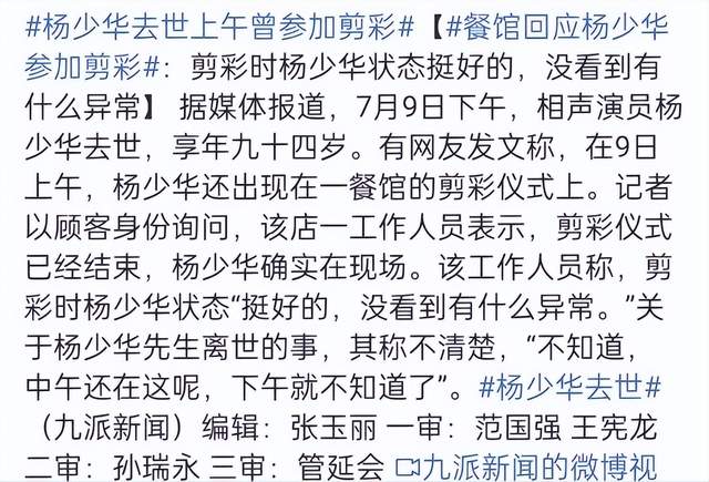 7月9日,著名相声表演艺术家杨少华老先生与世长辞,享年94岁。消息一出,曲艺界震动,不仅同行还有网友们纷纷发文悼念。苗阜一句"一辈子了!走好"道尽行业情谊,但是许多人却将目光聚焦在老爷子人生最后的画面上——当天上午,他竟被轮椅推至烈日下的商业活动,下午便传来噩耗。这戏剧性的转折,让"杨少华晚年生活"瞬间冲上热搜,引发热议。